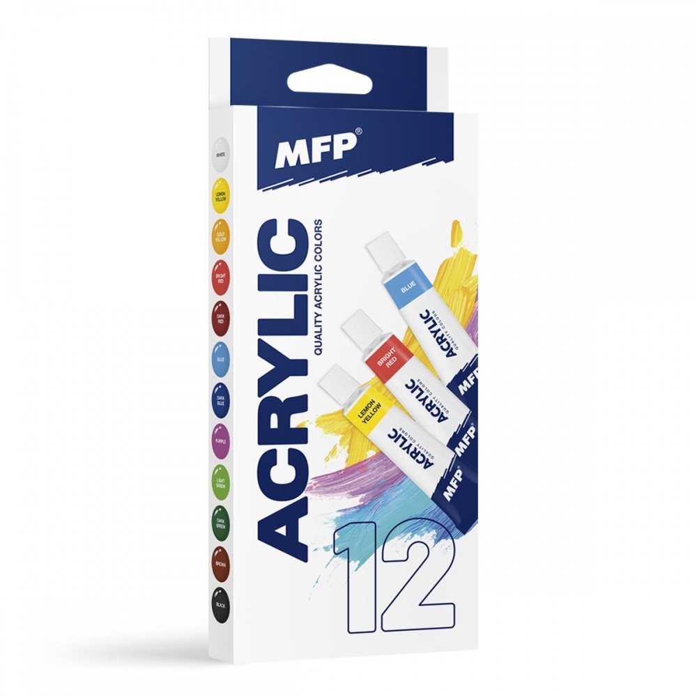 Akrylové barvy jsou vodou ředitelné a po zaschnutí voděodolné. Vyznačují se svou barevnou sytostí i stálostí, jemnou a hladkou konzistencí a velmi dobrými krycími schopnostmi. Jsou vhodné na všechny nemastné a hladké povrchy, jako jsou plátna, papír, dřevo, kámen atd. Velkým hitem pro děti i dospělé je i malování na kamínky. Po zaschnutí doporučujeme barvu ještě zafixovat akrylovým lakem, který kresbu dokonale ochrání. Set obsahuje 12 barev v kovových tubách. Rozměr: 100mm x 240mm x 20mm (Š x V x H)