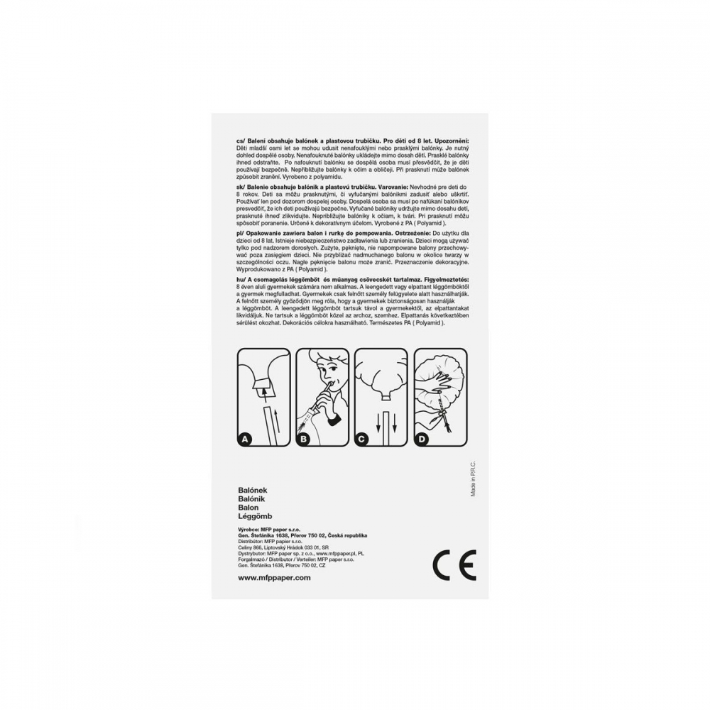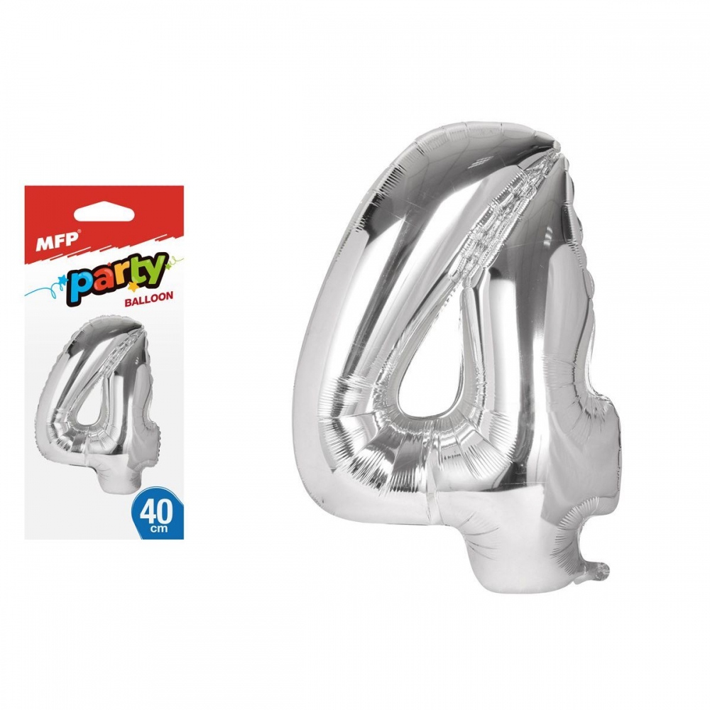 Nafukovací fóliový balónek ve tvaru čísla 4. Balónek je vyroben ze stříbrné fólie. Na horní straně balónku jsou očka na přivázání. Výška balónku: 40 cm. Věk: 8+