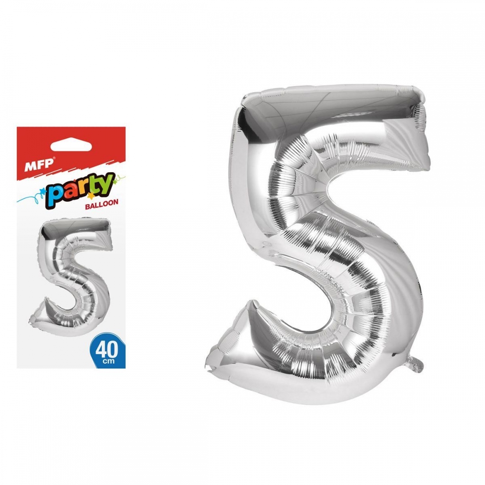Nafukovací fóliový balónek ve tvaru čísla 5. Balónek je vyroben ze stříbrné fólie. Na horní straně balónku jsou očka na přivázání. Výška balónku: 40 cm. Věk: 8+