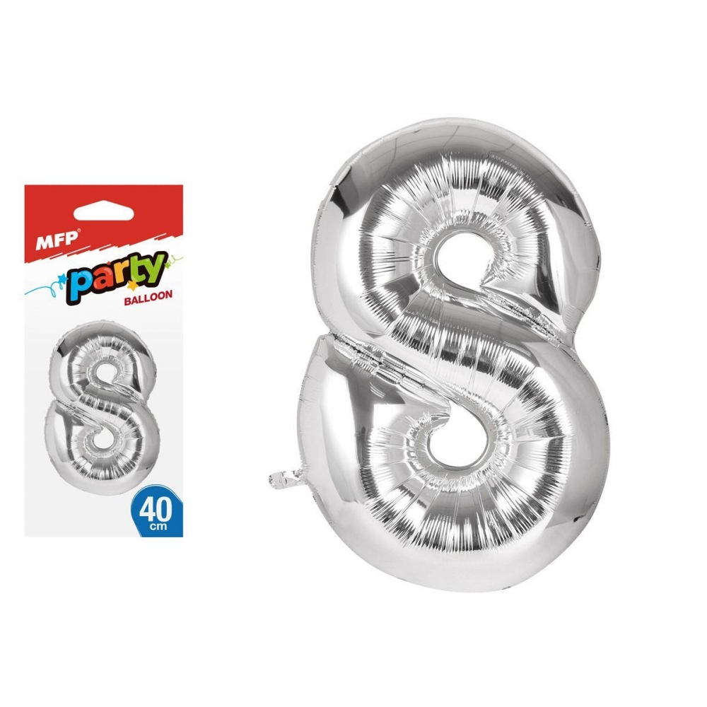 Nafukovací fóliový balónek ve tvaru čísla 8. Balónek je vyroben ze stříbrné fólie. Na horní straně balónku jsou očka na přivázání. Výška balónku: 40 cm. Věk: 8+