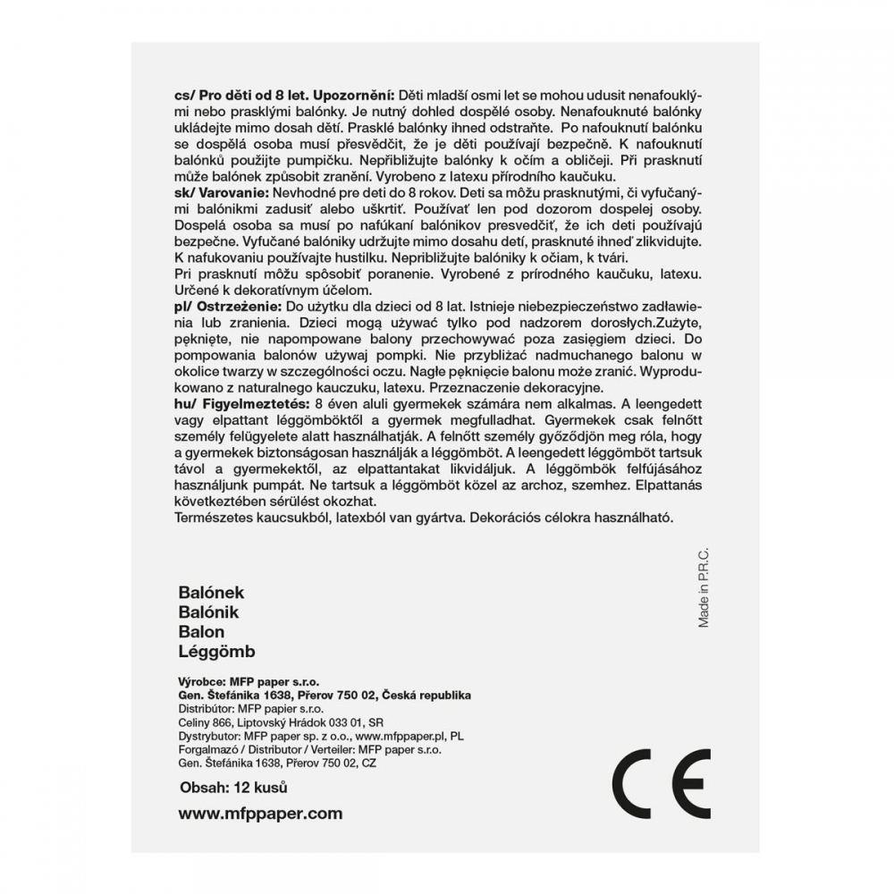 Nafukovací balónek M metal 12 ks sáček 1,8 g. Balónky jsou oblíbeným dekoračním doplňkem na narozeninové oslavě či jiné významné události. Nafukovací balónky nesmí chybět na žádné oslavě, dodají tu pravou atmosféru do celé místnosti a narozeninová párty může začít! BALENÍ OBSAHUJE: - 12 ks metalových balónků (stříbrná, žlutá, fialová, modrá, zelená) VAROVÁNÍ: Vhodné pro děti od 8 let. Děti se mohou prasklými či vyfouknutými balónky zadusit nebo uškrtit. Používejte pouze pod dozorem dospělé osoby. Dospělá osoba se po nafouknutí balónku musí přesvědčit, že jej děti používají bezpečně. Vyfouklé balónky udržujte mimo dosah dětí a prasklé ihned zlikvidujte. K nafukování balónků použíjte pumpičku. Nepřibližujte balónky k očím a obličeji. Při prasknutí může balónek způsobit zranění. Vyrobeno z přírodního kaučuku, latexu. Určeno k dekorativním účelům. Nebezpečí vdechnutí a spolknutí malých částic. Dodáváme v sáčku se závěsem. Uvedená cena je za 1 balení po 12 ks. Rozměr: 50mm x 100mm x 1mm (Š x V x H)