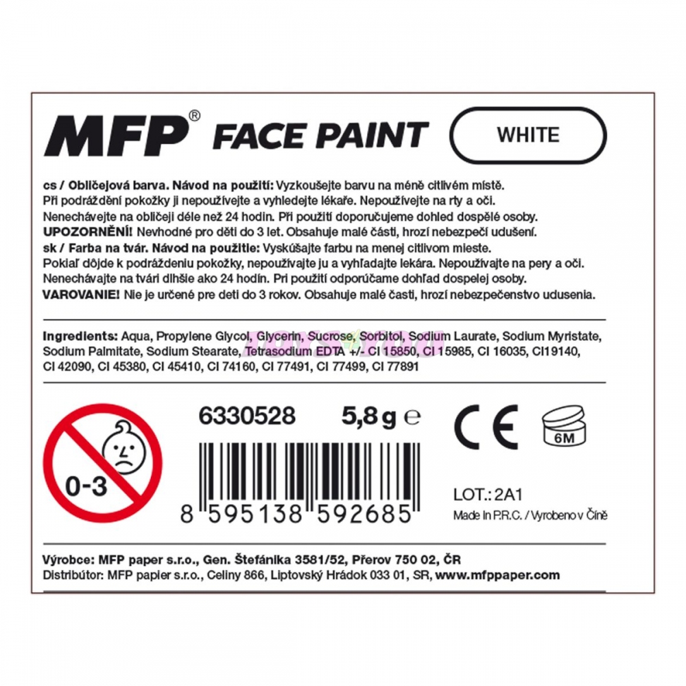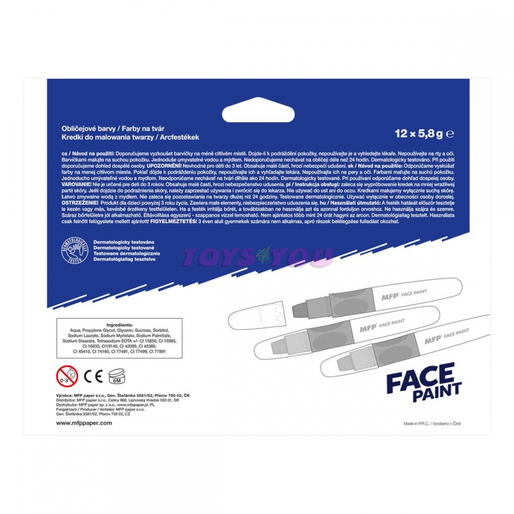 Barva na obličej bílá, na principu rtěnky (6 g). Díky těmto pestrým barvám vykouzlíte na tváři dítěte krásnou masku na karneval, párty nebo jinou oslavu. Dermatologicky testováno. Barva: červená NÁVOD NA POUŽITÍ: 1. Doporučujeme vyzkoušet barvičky na méně citlivém místě. 2. Dojde-li k podráždění pokožky, nepoužívejte a vyhledejte lékaře. 3. Nepoužívejte na rty a oči. 4. Barvičkami malujeme na suchou pokožku. 5. Jednoduše omyvatelné vodou a mýdlem, barvy zdravotně nezávadné. 6. Nedoporučujeme nechávat na obličeji déle než 24 hodin. 7. Při použití doporučujeme dohled dospělé osoby. VAROVÁNÍ: Nevhodné pro děti do 3 let, nebezpečí spolknutí malých částí. Všech 12 ks je baleno v papírové krabičce. Uvedená cena je za 1 ks. Hmotnost: 0.02 kg Varování: Nevhodné pro děti do 3 let. Obsahuje malé části, hrozí nebezpečí udušení. Výrobek splňuje certifikaci CE Výrobek je určen pro děti od 3 let Rozměr: 20mm x 130mm x 20mm (Š x V x H). Cena za jeden kus.