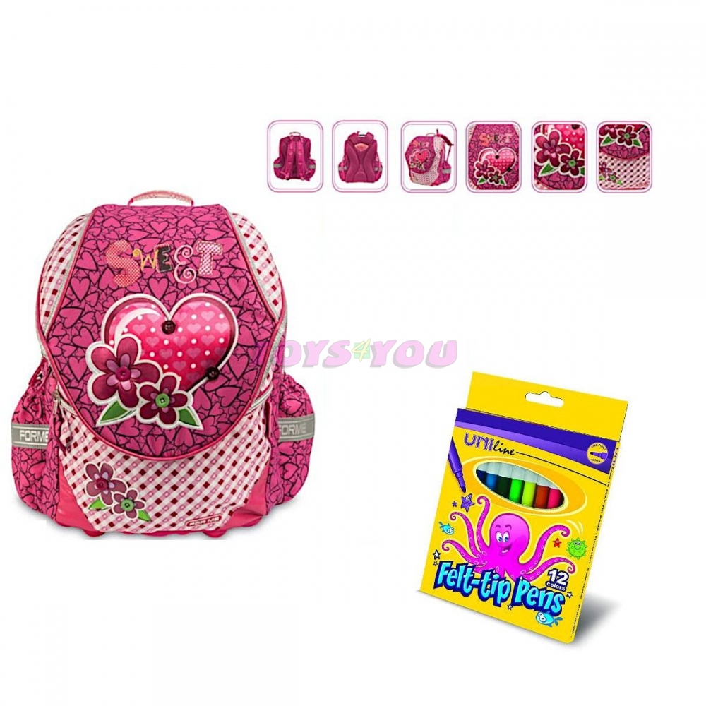 Školní batoh ergonomický splňující veškeré zdravotnické požadavky. Má anatomicky tvarované záda, uvnitř batohu je odlehčená hlíniková konstrukce,kterou lze jednoduše vyndat. Batoh má polstrované popruhy. Je velmi stabilní. Má pevné dno a ouško na zavěšení. Má reflexní prvky, pro lepší bezpečnost. Batoh je vhodný i pro prvňáčky.Vnitřní prostor je členěn na dvě části, zapínání na zip.Batoh má 2 boční kapsy + 1 menší přední kapsu Rozměry: 41x33x22cm. + Souprava barevných fixů. Zářivé barvy. Hrot odolný proti zatlačení či poškození, účinný uzávěr. Snadno vypratelné. Věk: 3+
