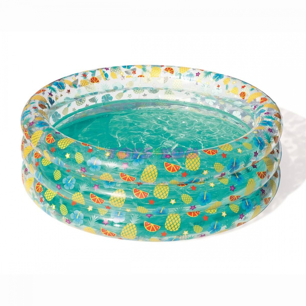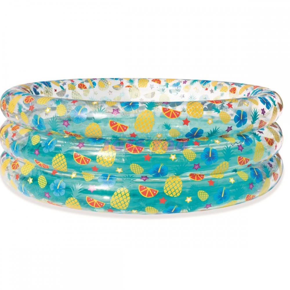 Nafukovací bazén má 3 kruhové, průhledné prstence s potiskem ovoce. Max. kapacita vody: 445 L. Rozměr: 150x53 cm