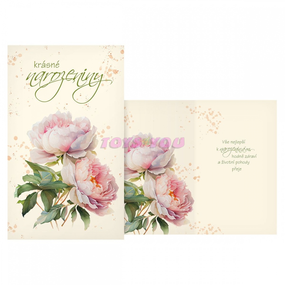 Srdečné přání k narozeninám s textem a obrázkem pivoněk. Potěšte oslavence a spolu s dárkem mu věnujte originální a krásné přáníčko, které mu bude připomínat tuto radostnou událost. Text na přední straně přání: Krásné narozeniny Text uvnitř přání: Všechno nejlepší k narozeninám, hodně zdraví a životní pohody přeje Papír: pohlednicový karton 240 g Přání je baleno v sáčku, součástí balení je i dopisní obálka. Uvedená cena je za 1 ks.