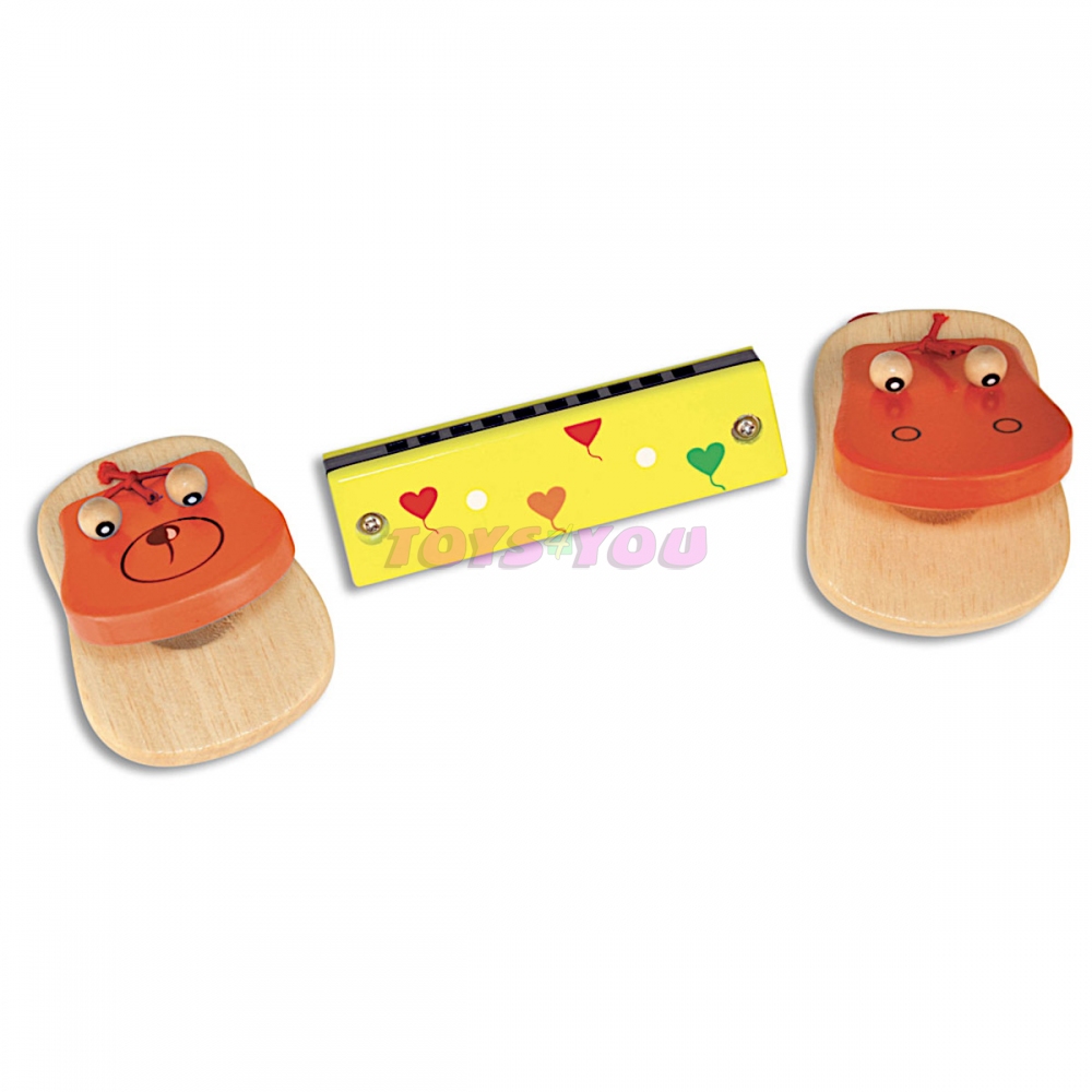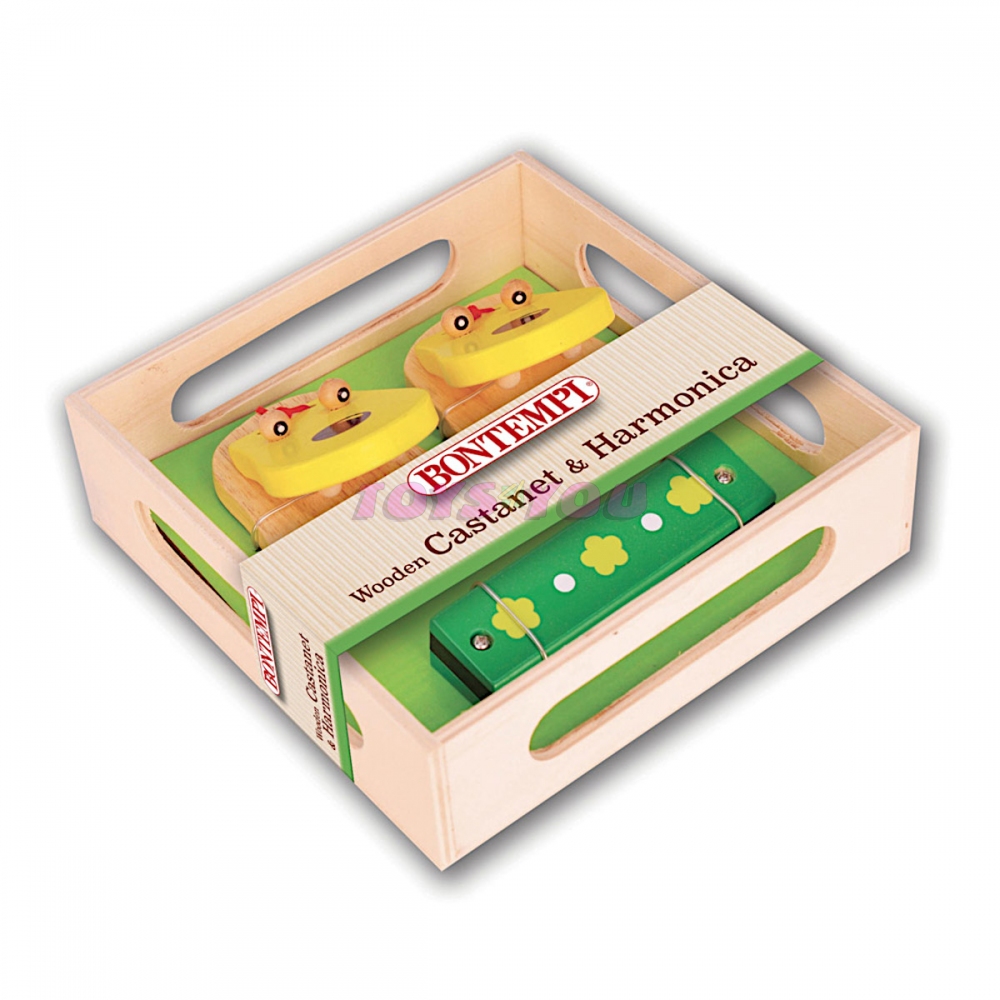 Bontempi 2 kastaněty a 1 harmonika s dřevěnou konstrukcí. Kastaněta velikost 60×75×50 mm • Harmonika: Délka 105 mm