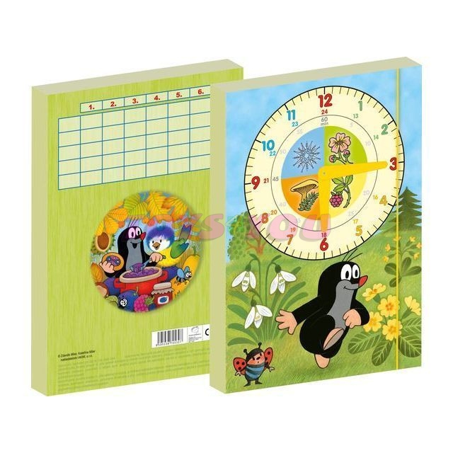 Box na sešity A4 s gumou. Pevný, ale lehký kašírovaný materiál s lesklou povrchovou úpravou (lamino). Pevnost materiálu zastupuje ochranu vkládaných školních pomůcek do tohoto boxu i při nižší hmotnosti zvoleného materiálu,toto byl výrobní záměr z důvodu velkého množství školních potřeb, a tudíž vysoké jejich hmotnosti. Box opatřen zabezpečovací gumičkou proti otevření, součástí boxu jsou procvičovací hodiny z lícové strany a z rubové rozvrh hodin, tedy tzv. 3v1 (box + hodiny + rozvrh)