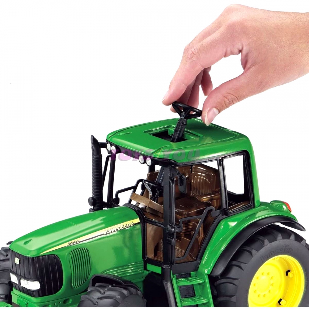 Traktor John Deere 6920 včetně čelního nakladače. S otevíráním motoru, funkční řízení - součástí druhý volant s delším ramenem, který se instaluje do stávajícího volantu a provlékne výsuvným otvorem ve střeše - usnadní podstatným způsobem ovládání stroje. Možnost připojení různých vleků a příslušenství. Vyrobeno v měřítku 1:16. Rozměr: 385x177x165 mm. Věk: 3+