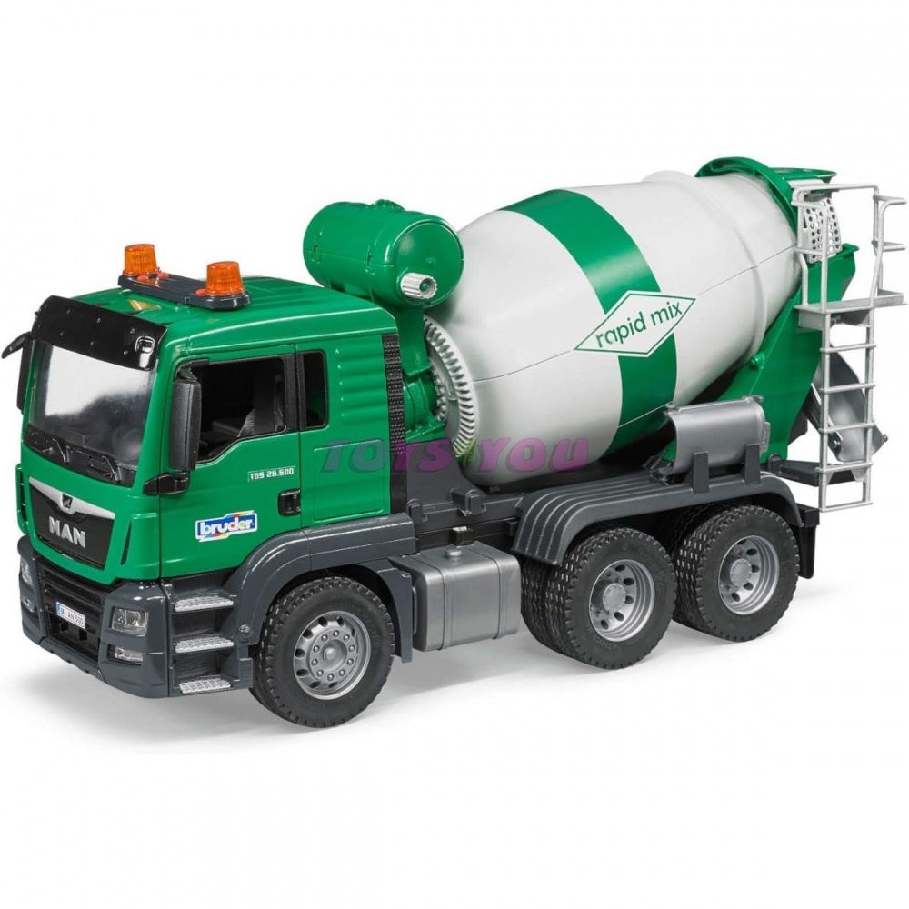 míchačka betonu BRUDER 2739 vychází ze známého a osvědčeného MAN TGA. kabina řidiče je sklopná a umožňuje pohled na blok motoru. Buben modernizovaného domíchávače betonu lze otáčet ruční klikou namontovanou v nádrži na vodu. Buben obsahuje dopravní a míchací šnek a stejně jako originál se buben vyprazdňuje obrácením směru otáčení. Šnek uvnitř bubnu pak dopravuje produkt zpět do vyhazovacího žlabu. Součástí dodávky jsou dva žlaby k připevnění.