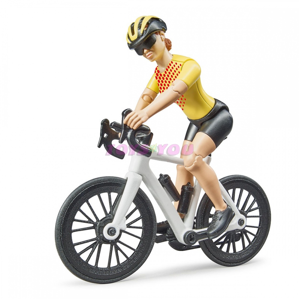 Že jste spíše příznivci sportu? Tak pro vás je model Bruder 03485 jako stvořený. Vydejte se se svojí cyklistkou na výlet po Bruder světě a objevujte jeho krásy. Figurka Cyklistky je oblečená ve stylovém sportovním oblečení, kvůli bezpečnosti má také helmu. Figurka má pohyblivé končetiny a samozřejmě nechybí ani kolo, na kterém se jistě ráda vydá na výlety. Po dlouhém výletu se může vrátit na místo, kde nechala své krásné sportovní auto a vydat se domů. Jízdní kolo má odnímatelná kola.