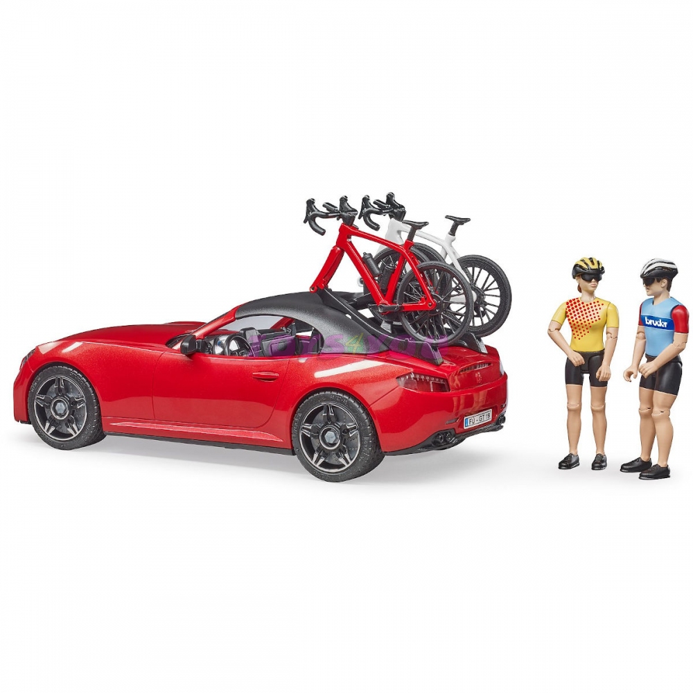 Sportovní auto Dodge s nosičem na kola, figurku cyklistky a jízdní kolo