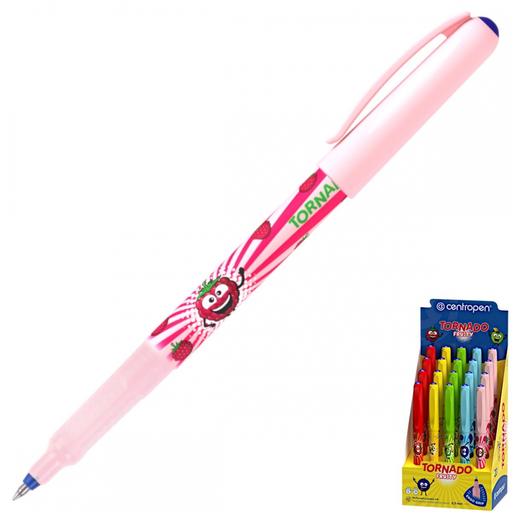 Centropen - TORNADO 0,5 FRUITY 2675 -TORNADO fruity ve zcela novém , atraktivním designu a s osvědčeným ERGO držením a „masážními body“, které aktivují na bříškách prstů hmatové receptory a garantují zdravé psaní bez únavy. Vhodná náhrada plnicích per pro školáky, píše lehce bez tlačení, ideální pro praváky, leváky i dysgrafiky, doporučeno pro první dětské psaní. Nový zmizíkovatelný modrý inkoust s příjemnou vůní malina, zaručuje velmi dlouhou, tenkou a rovnoměrnou stopu písma. Průměr kuličky 0,5 mm, šíře stopy 0,3 mm.