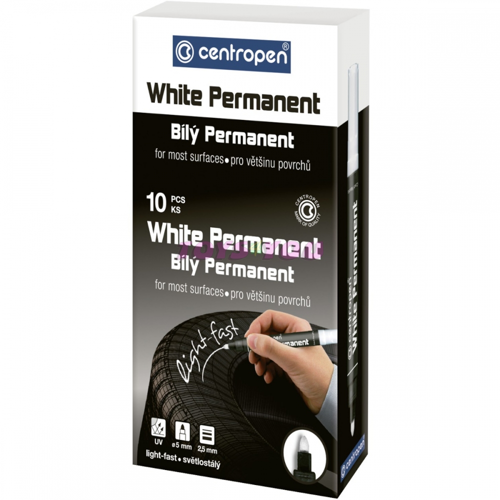 Univerzální značkovač, píše na většinu povrchů, po zaschnutí odolá za sucha otěru, na porézních površích permanentní, světlostálý, Značkovač na vodní bázi s válcovým hrotem, šířka stopy 2,5 mm