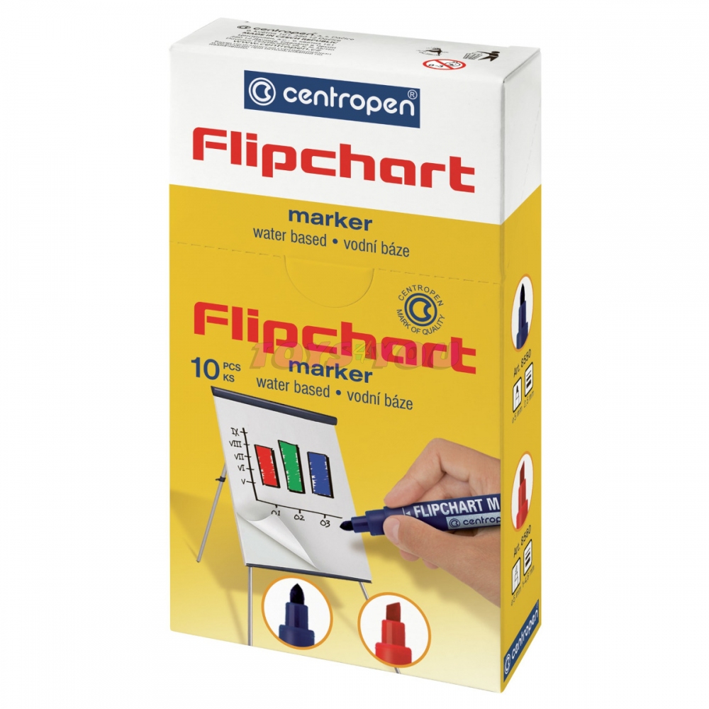 Centropen - ART. 8550 FLIPCHART Značkovač je určen pro psaní na papír, zejména na papírové tabule Flipchart. Vysoká odolnost proti zasychání inkoustu v hrotu. Funkčnost otevřeného značkovače je 1 týden. Inkoust na vodní bázi se nepropíjí papírem a je bez zápachu. Válcový hrot, šíře stopy 2,5 mm.