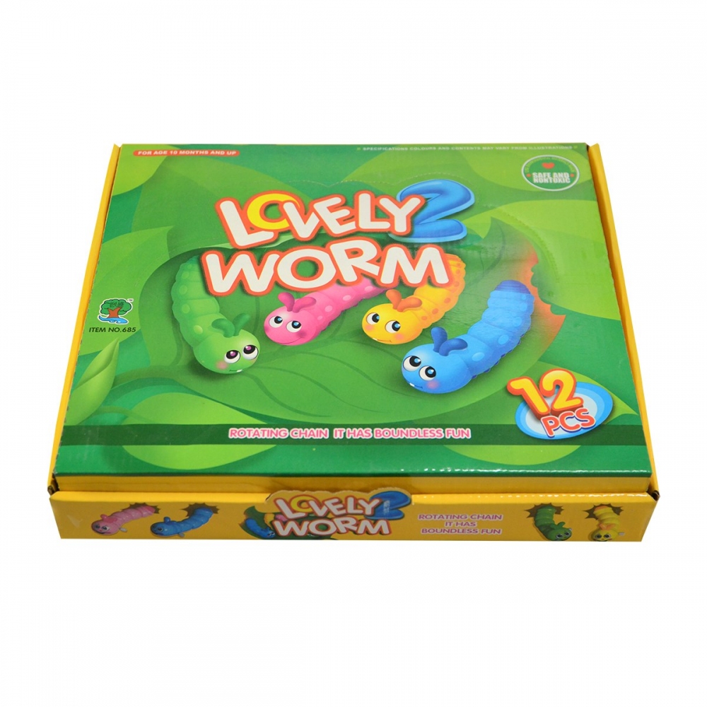 Červ na klíček. Materiál: plast. Assort: 4 barvy (modrá, žlutá, zelená, růžová). Červík po natažení na klíček se plazí. Věk: 3+