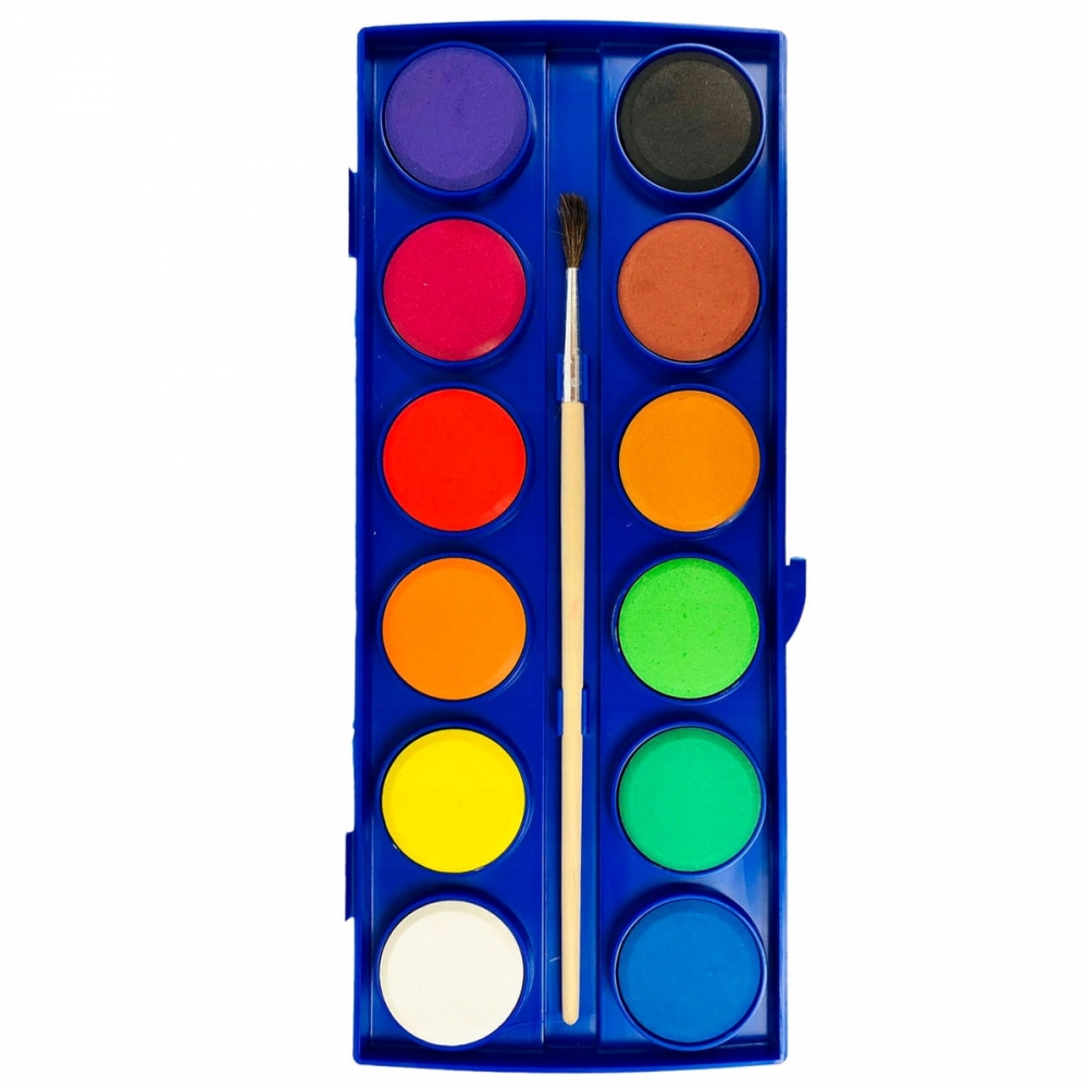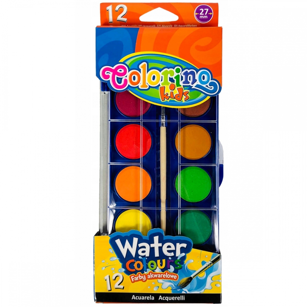 Colorino R14014PTR vodové barvy. Kvalitní vodové barvy s vysokým podílem pigmentu. Při opakovaném používání nepopraskají. Praktické plastové pouzdro s kulatým štětcem s dřevěnou násadkou. pro školky a školy barva: průměr 27 mm pouzdro: 21 x 9 cm pro děti od 3 let balení: 12 barev + štětec