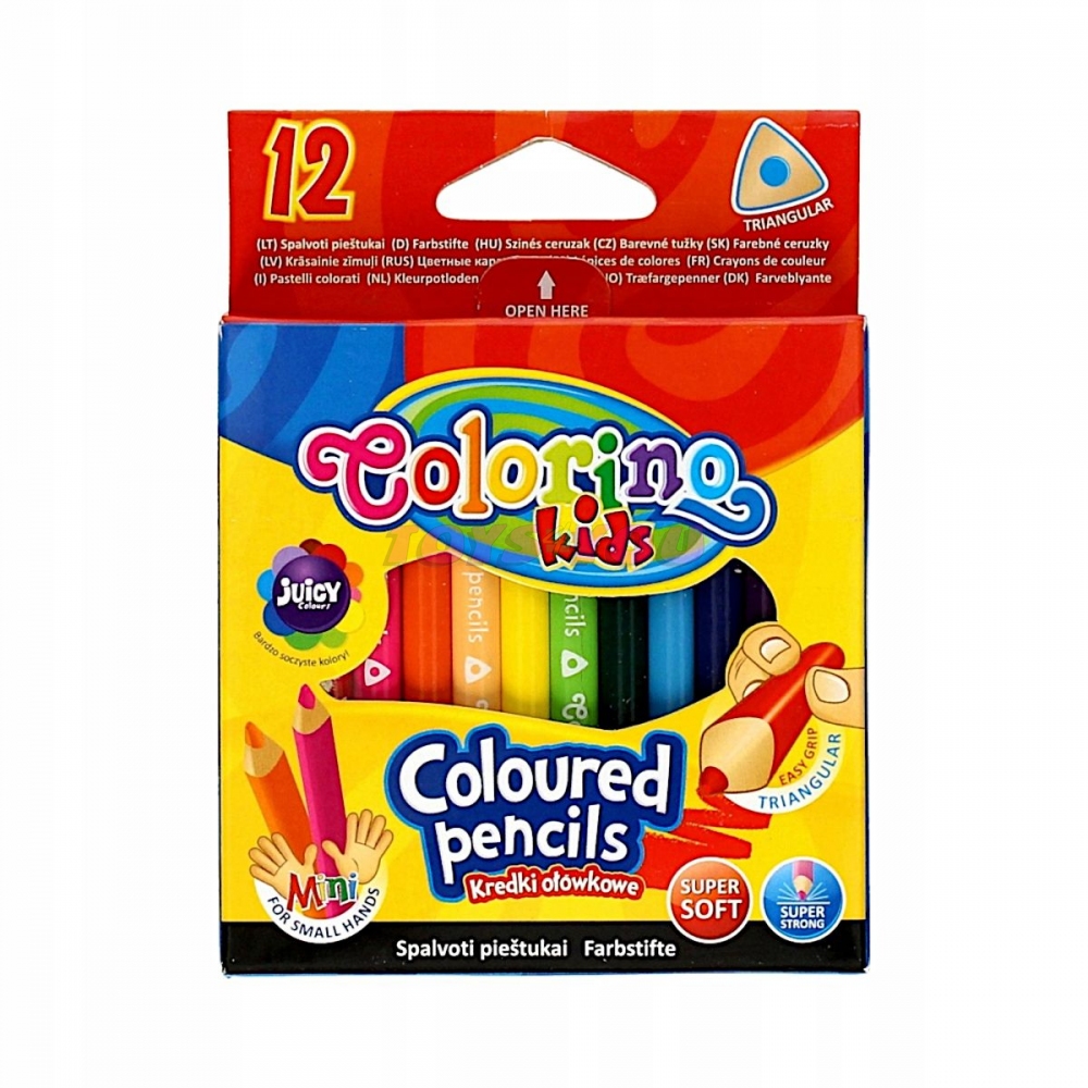 Colorino R33077PTR Pastelky trojhranné 12 barev. Sada krátkých pastelek ideální na cesty. Kvalitní pastelky v ergonomickém tvaru pro správné držení. Extra měkké pro snadné kreslení. tuha se při ořezávání neláme vysoký obsah pigmentů- syté barvy hroty odolné vůči tlaku délka: 89 mm balení: 12 barev