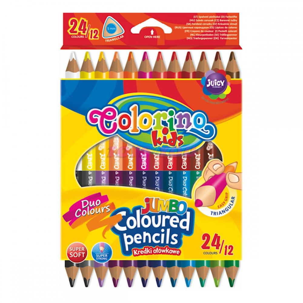 Velké, oboustranné pastelky v ergonomickém tvaru pro správné držení. Měkké kreslení sytými barvami díky vysokému obsahu pigmentů. Při ořezávání se tuha neláme, jelikož je lepena po celé délce pastelky. trojhranné JUMBO oboustranné mimořádně odolné hroty balení: 24 barev