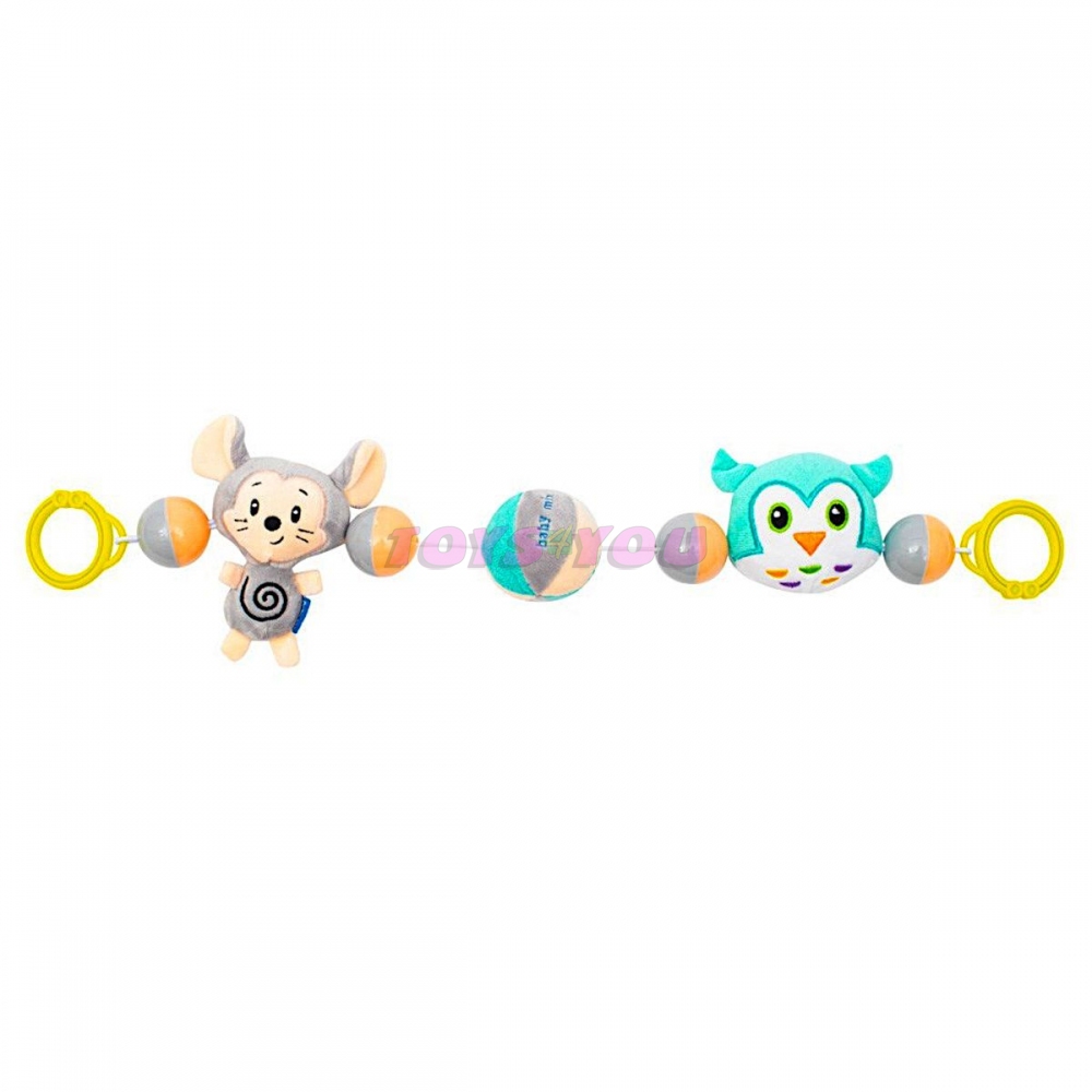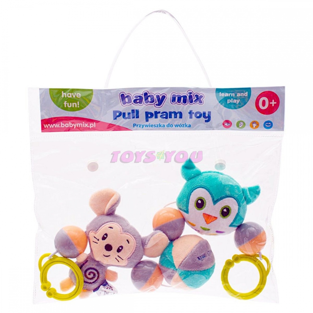Plyšové chrastítko Baby Mix na gumičce do kočárku. Má dvě plyšové figurky, míček a čtyři plastové kuličky, které chrastí. Délka cca 50 cm, výška figurek cca 12 cm. Chrastítko je vhodné pro děti od narození. Věk: 0+