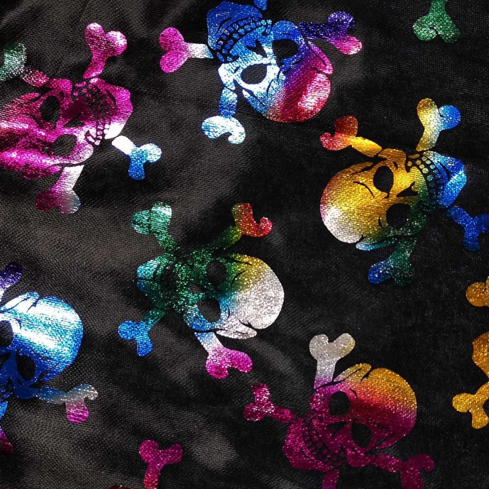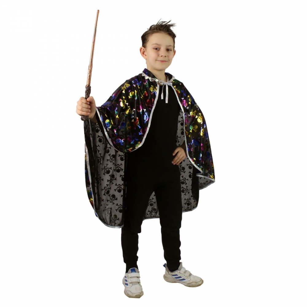 Dětský plášť s lebkami. Senzační plášť pro všechny čarodějnice a čaroděje! Plášť na zavazování je určen pro děti od 3 do 7 let. Tento stylový kousek má límeček a je dekorován balevným metalickým potiskem lebek. Vhodný i na oslavu Halloweenu. Rozměry balení Š×V×H,270×380×5 mm. Věk: 3+