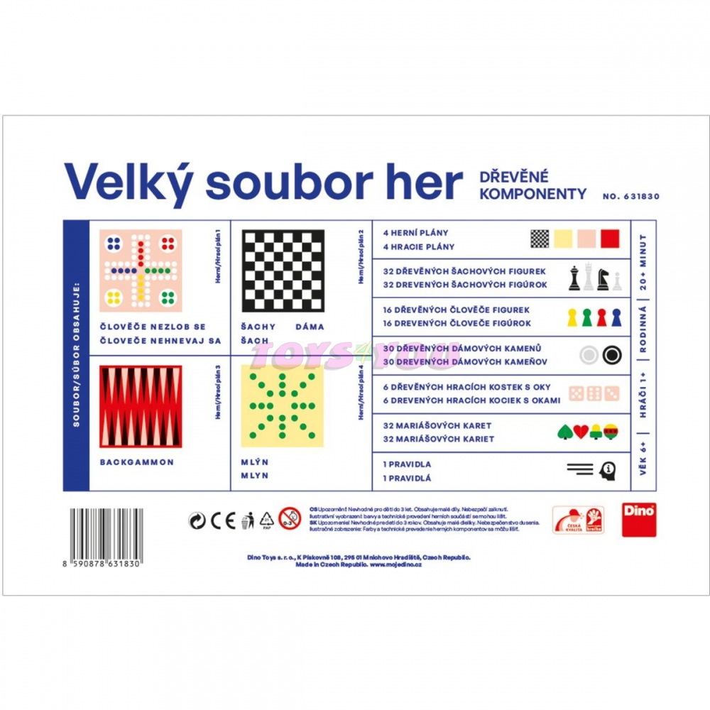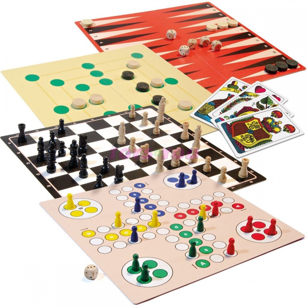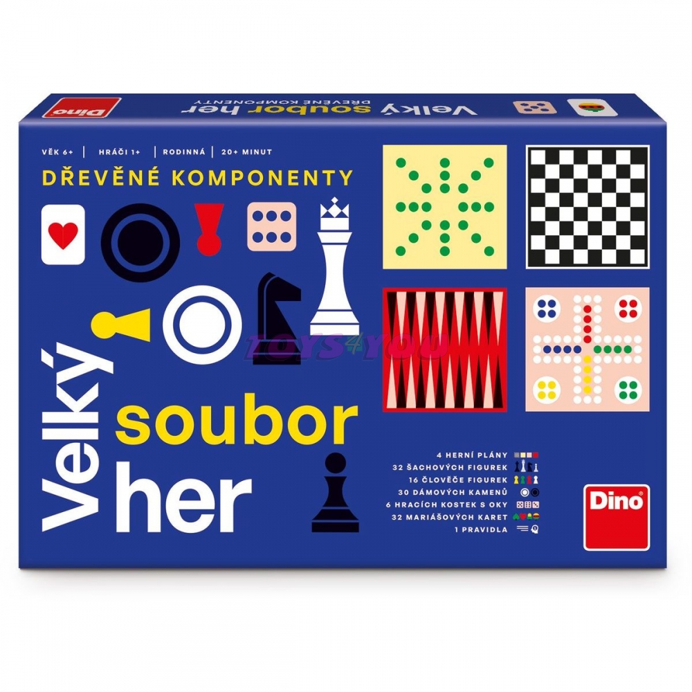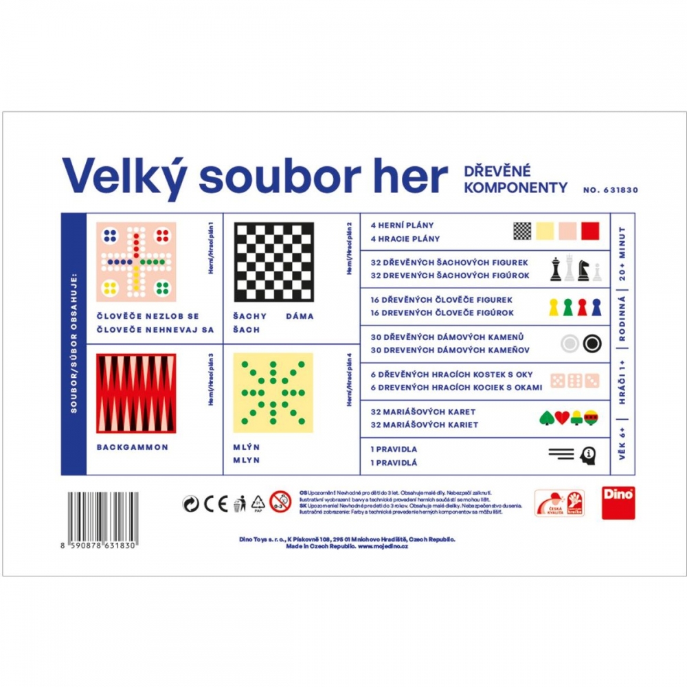 Soubor obsahuje: 2 oboustranné herní plány, 32 dřevěných šachových figurek, 30 dřevěných dámových kamenů, 16 dřevěných člověče figurek, 32 mariášových karet, 6 dřevěných bodových kostek, 1 pravidla.