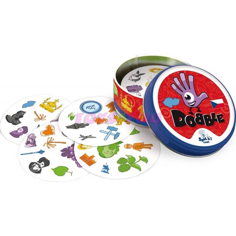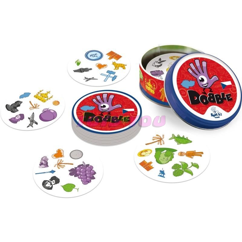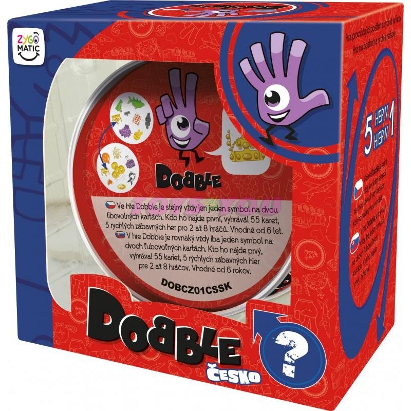 Populární postřehová hra nyní na motivy Česka. Rychlost, postřeh, reflexy. Dobble to je 50 různých symbolů, 55 karet, 8 symbolů na kartě a každé dvě karty spolu mají společný pouze jeden. Hra nabízí zcela unikátní zábavu. Hráči zde hledají dva stejné symboly na kartách při různých verzích hry (v pravidlech je popsáno celkem 5 her). Super jsou kulaté karty i jednoduchá pravidla vysvětlená doslova za pár sekund. Plechová krabička zaručuje bezpečí karet a je i další přidanou hodnotou. Vyzkoušejte i Vy hru Dobble a budete nadšení, jak i tak jednoduchá hra může být zábavná! Hra pro 2-8 hráčů. Věk: 6+