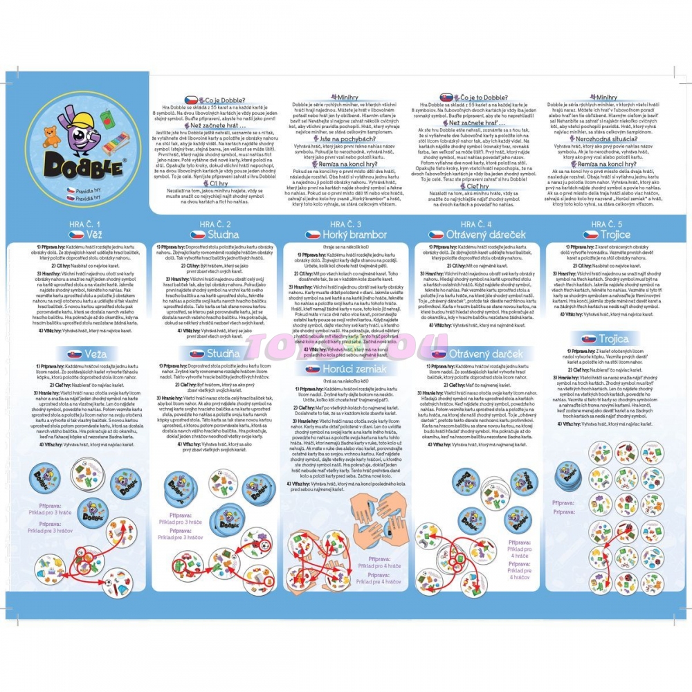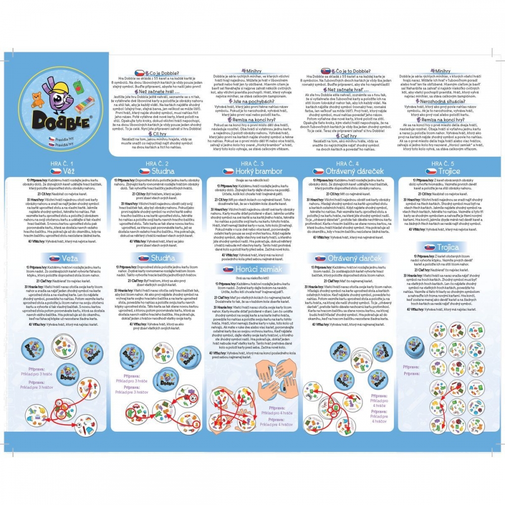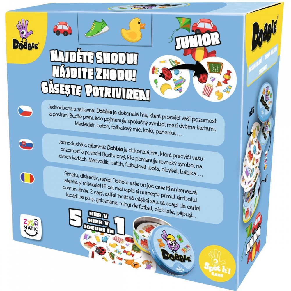 Rychlost, postřeh, reflexy! A hromada nových obrázků pro děti. Dobble, to je 55 karet, 8 symbolů na kartě a každé dvě karty spolu mají společný pouze jeden! Hra nabízí zcela unikátní zábavu. Hráči zde hledají dva stejné symboly na kartách při různých verzích hry (v pravidlech je popsáno celkem 5 her). Super jsou kulaté karty i jednoduchá pravidla vysvětlená doslova za pár sekund. Cílová skupina jsou děti i rodiče - všichni, kdo se chtějí pořádně bavit a nemají čas pročítat dlouhá pravidla. Plechová krabička zaručuje bezpečí karet a jednoduše umožňuje mít hru vždy u sebe. Vyzkoušejte i Vy postřehový fenomén Dobble a jistě budete překvapeni, jak i tak jednoduchá hra může být zábavná! Tato Junior verze přináší zcela novou sadu výrazných zábavných symbolů pro nejmladší hráče. Obsah balení: 55 karet v plechové krabičce 1 česká, slovenská a rumunská pravidla Hra pro 2-8 hráčů. Věk: 4+