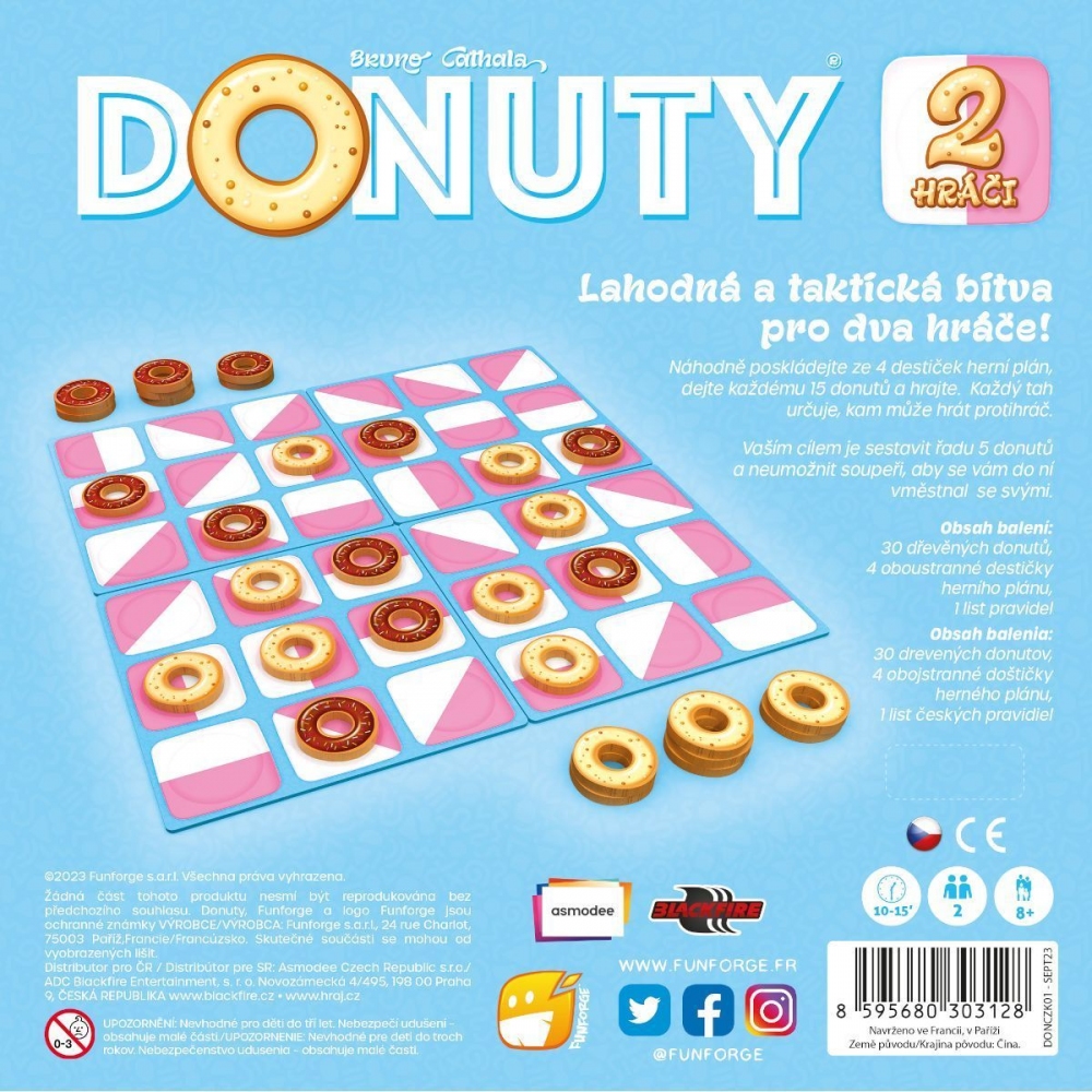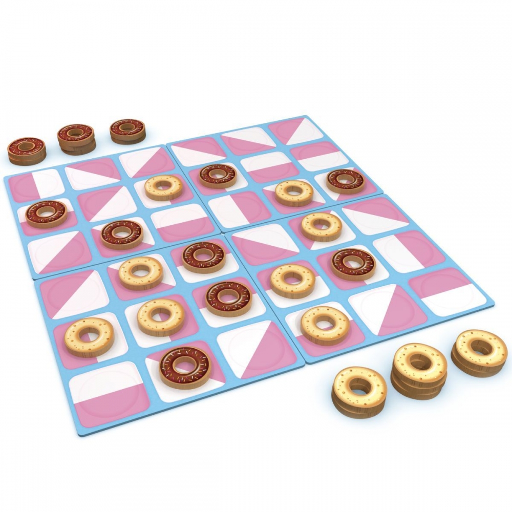 Piškvorky trochu jinak. Lahodná a taktická bitva. Náhodně poskládejte ze 4 destiček herní plán, dejte každému 15 donutů a hrajte. Každý tah určuje, kam může hrát protihráč. Vaším cílem je sestavit řadu 5 donutů a neumožnit soupeři, aby se vám do ní vměstnal se svými. Jak hrát: První z vás umístí svůj donut na libovolné pole na herní ploše. Čára na poli, na které jste právě položili svůj donut, určuje, kam může zahrát svůj donut protihráč. Váš protihráč pak umístí jeden svůj donut na libovolné volné pole ve směrech určených touto čarou. Po umístění protihráčova donutu hrajete opět vy, a i vy musíte svůj další donut položit v linii určené čarou na právě obsazeném poli. Takto se střídáte. Pokud jsou již všechna pole ve směru určeném protihráčovým zahraným donutem obsazena, ignorujte výše uvedené pravidlo a zahrajte svůj donut na libovolné volné pole. Umístíte-li jeden nebo více svých donutů mezi dva donuty vašeho protihráče, dojde ke "vložení". Jakmile dojde k této situaci, obrátíte dva protihráčovy donuty, které s právě umístěným sousedí, vaší barvou nahoru. Obsah balení: 30 dřevěných donutů 4 oboustranné destičky herního plánu 1 list pravidel (Věk 8+)