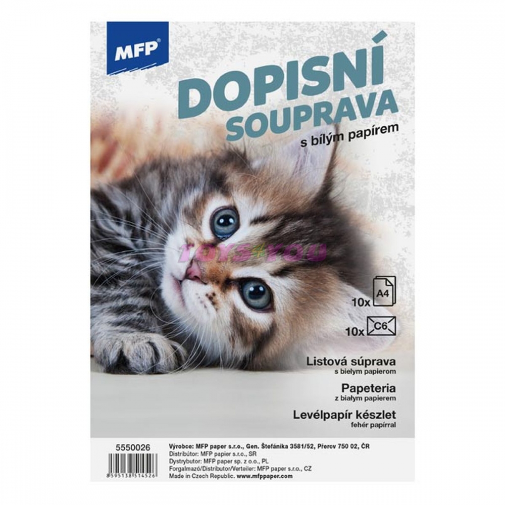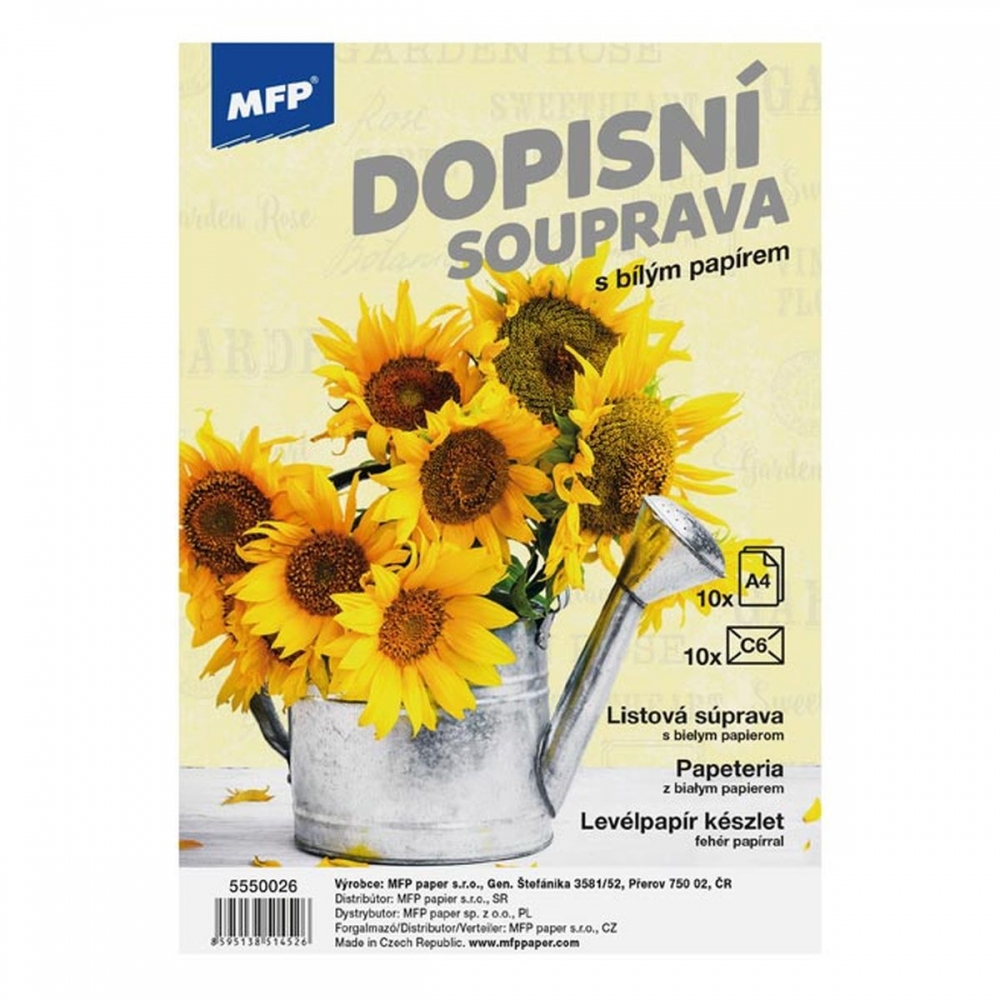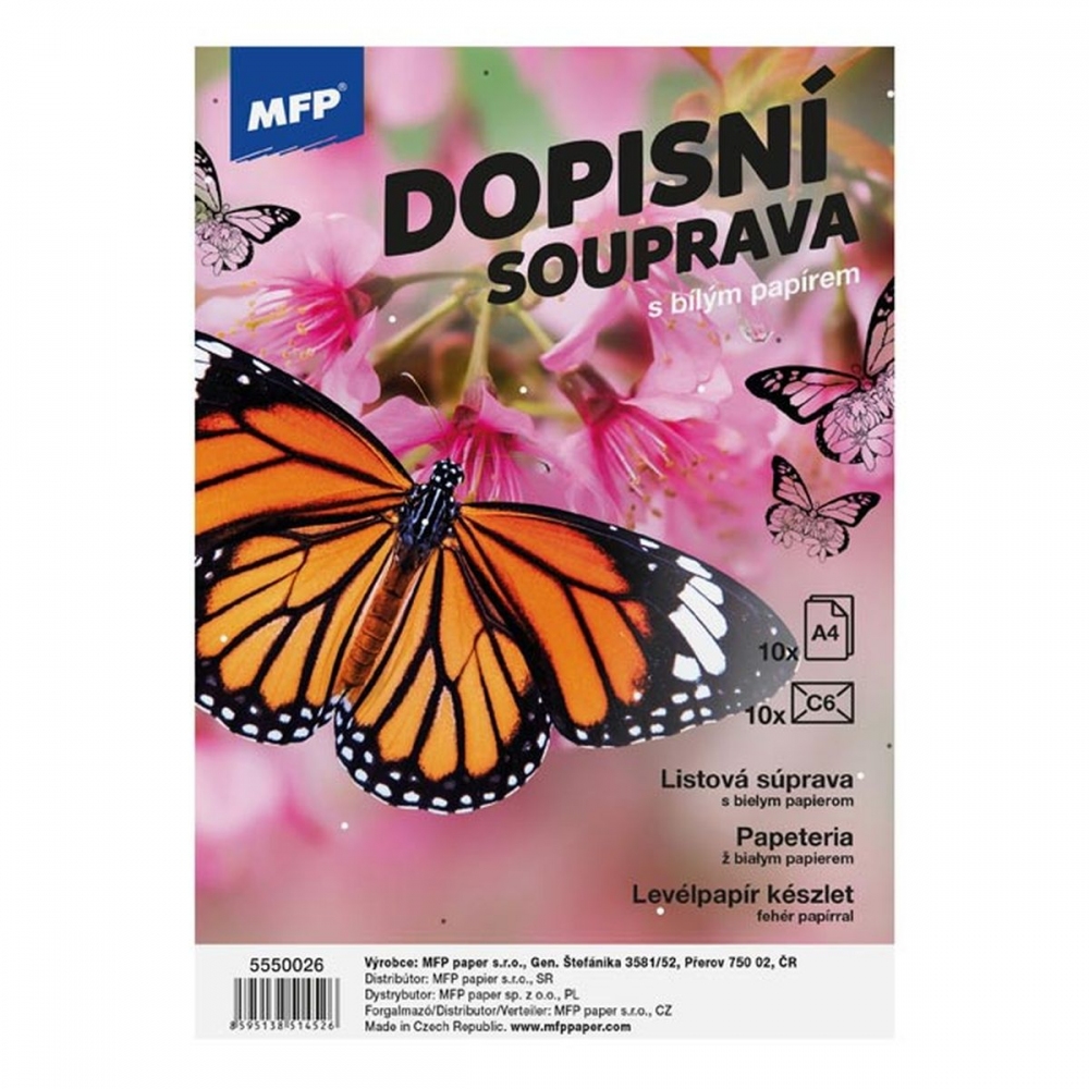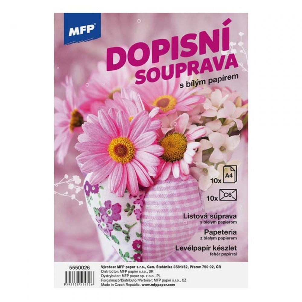 Dopisní souprava s bílým papírem bez linek. Sada určená pro posílání dopisů. Pořiďte si k soupravě také naše propisky, gelové pera nebo kuličková pera. BALENÍ OBSAHUJE: - 10 čistých dopisních papírů - 10 bílých poštovních obálek Formát: A4 Baleno v plastovém průhledném obalu se závěsem. Uvedená cena je za 1 balení. Hmotnost: 0.09 kg Rozměr: 149mm x 211mm x 8mm (Š x V x H) Vyrobeno v EU. Cena za 1 kus.