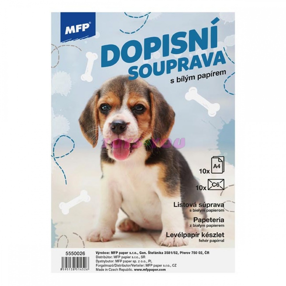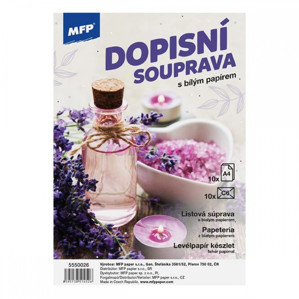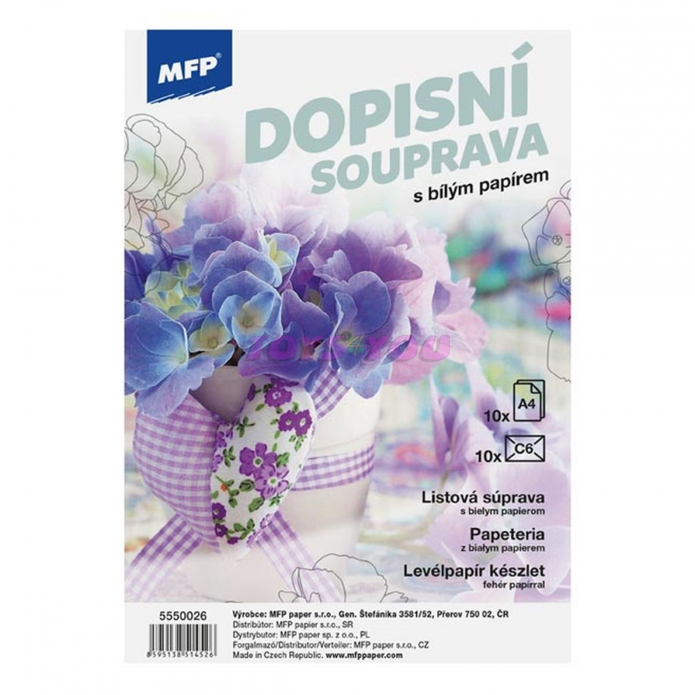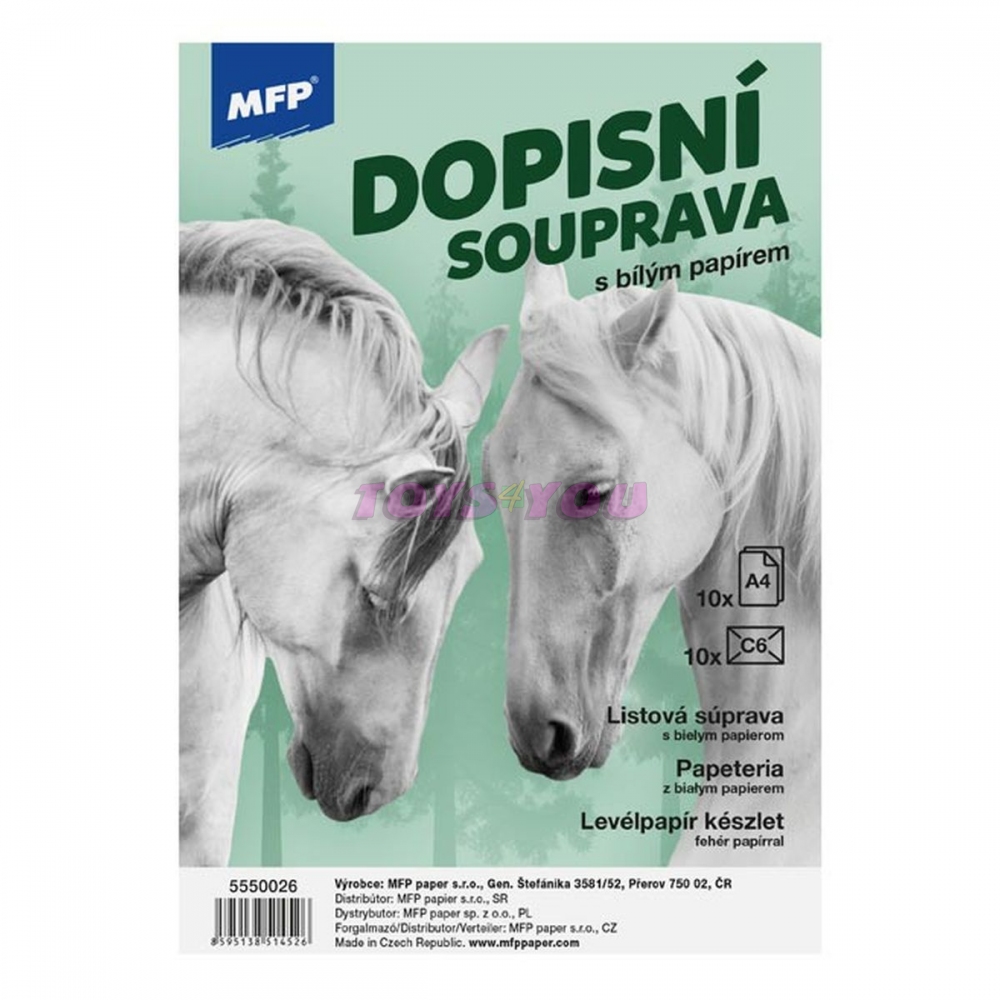 Dopisní souprava s bílým papírem bez linek. Sada určená pro posílání dopisů. Pořiďte si k soupravě také naše propisky, gelové pera nebo kuličková pera. BALENÍ OBSAHUJE: - 10 čistých dopisních papírů - 10 bílých poštovních obálek Formát: A4 Baleno v plastovém průhledném obalu se závěsem. Uvedená cena je za 1 balení. Hmotnost: 0.09 kg Rozměr: 149mm x 211mm x 8mm (Š x V x H) Vyrobeno v EU. Cena za 1 kus.