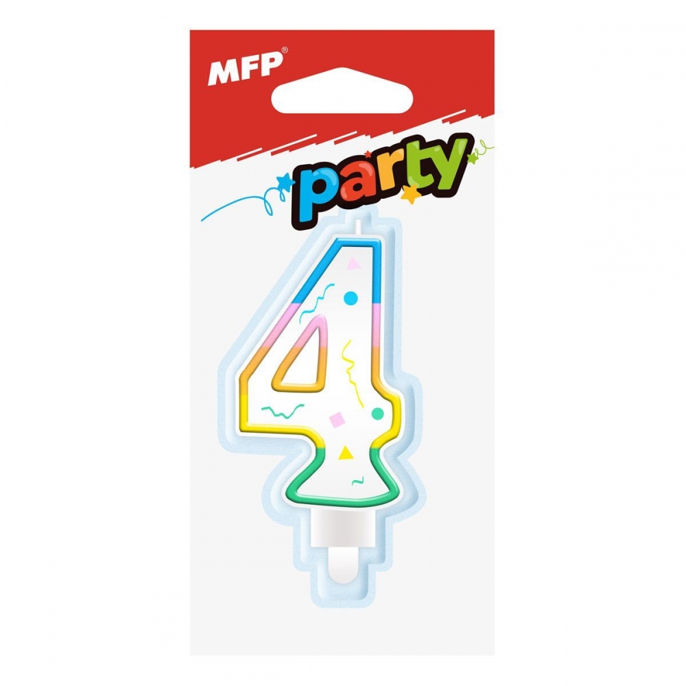 Dortová svíčka ve tvaru číslice 4, rozměr svíčky je 7,4 x 4,4 x 1,3 cm. Duhový potisk z jedné strany.