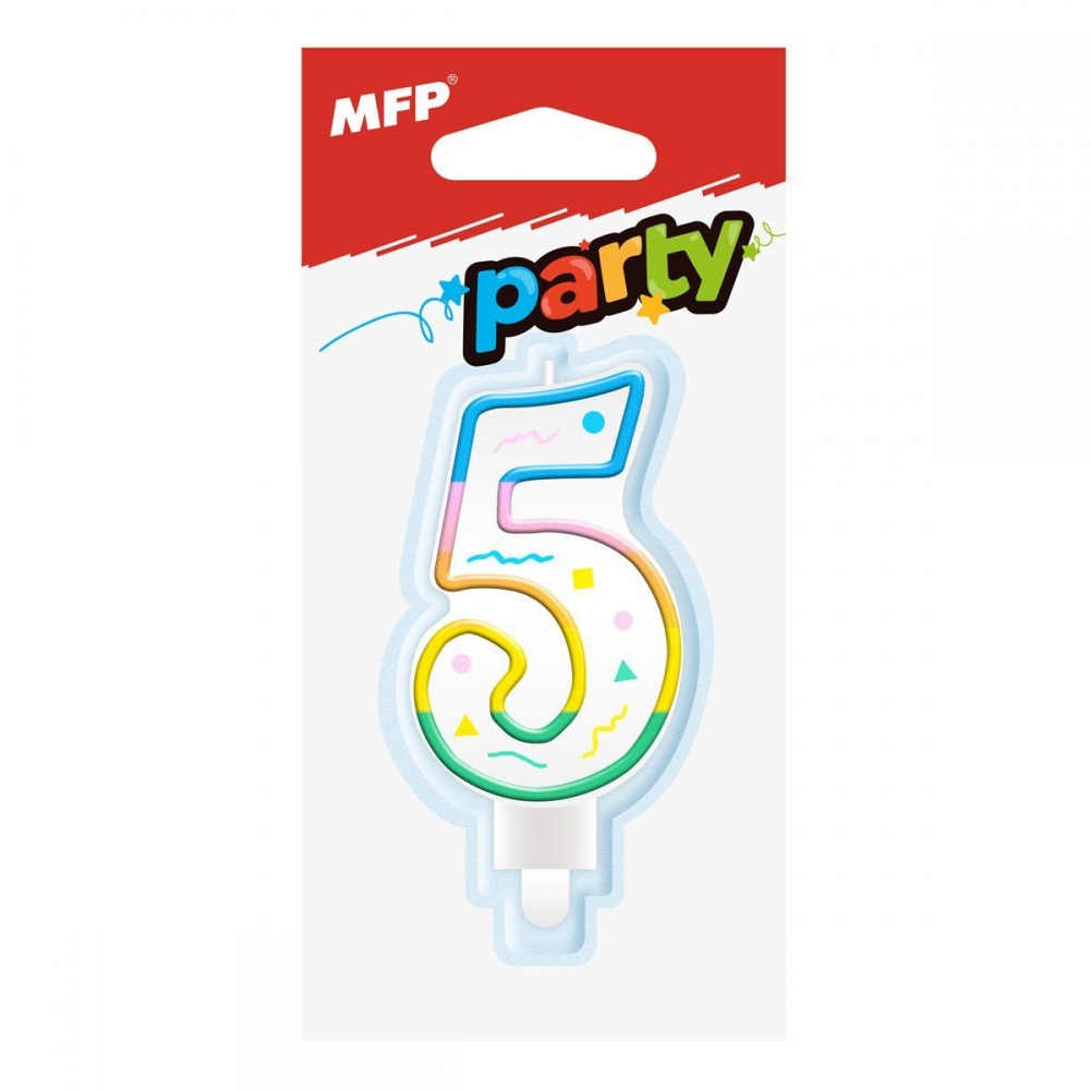 Dortová svíčka ve tvaru číslice 5, rozměr svíčky je 7,4 x 4,4 x 1,3 cm. Duhový potisk z jedné strany.