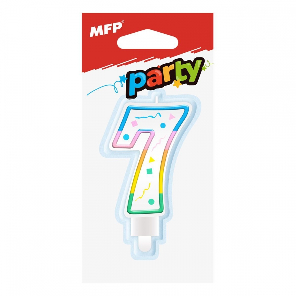 Dortová svíčka ve tvaru číslice 7, rozměr svíčky je 7,4 x 4,4 x 1,3 cm. Duhový potisk z jedné strany.