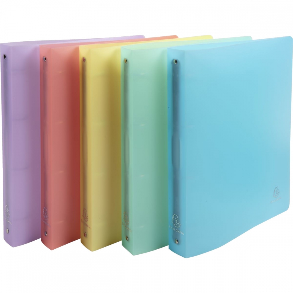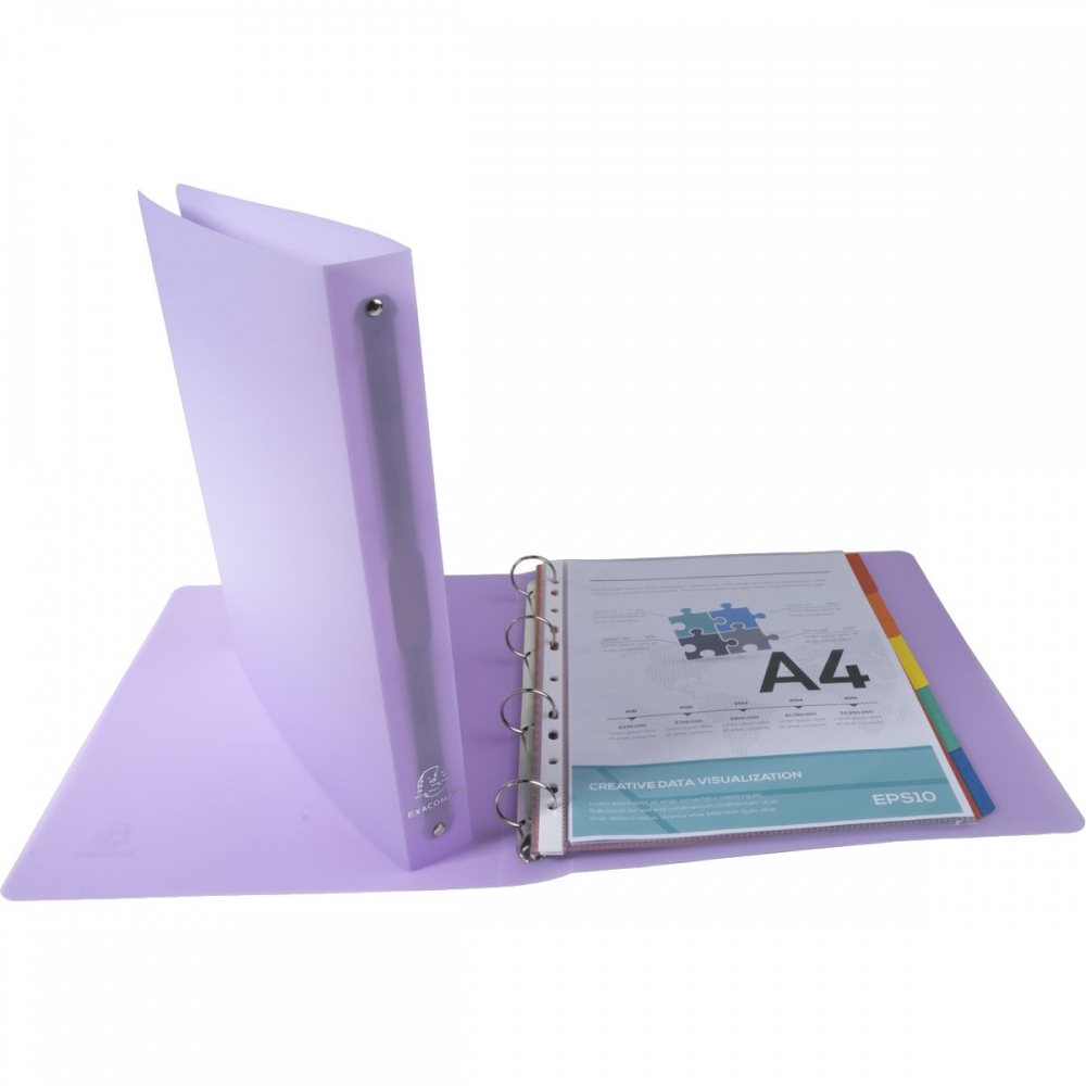 Exacompta X51970E Elegantní, praktický a odolný poloprůhledný pořadač v matných pastelových barvách (v nabídce 5 barev, na dotaz). Formát A4 maxi umožňuje založit euroobaly bez přesahu. Vhodný pro kanceláře, home office, školy. Desky jsou omyvatelné. Rrozměry: 268 x 320 mm, šířka hřbetu: 40 mm. Kapacita: 275 listů papíru (80 g), kroužková "O" mechanika: 4 x O 30 mm bez aretace, balení: 1 ks