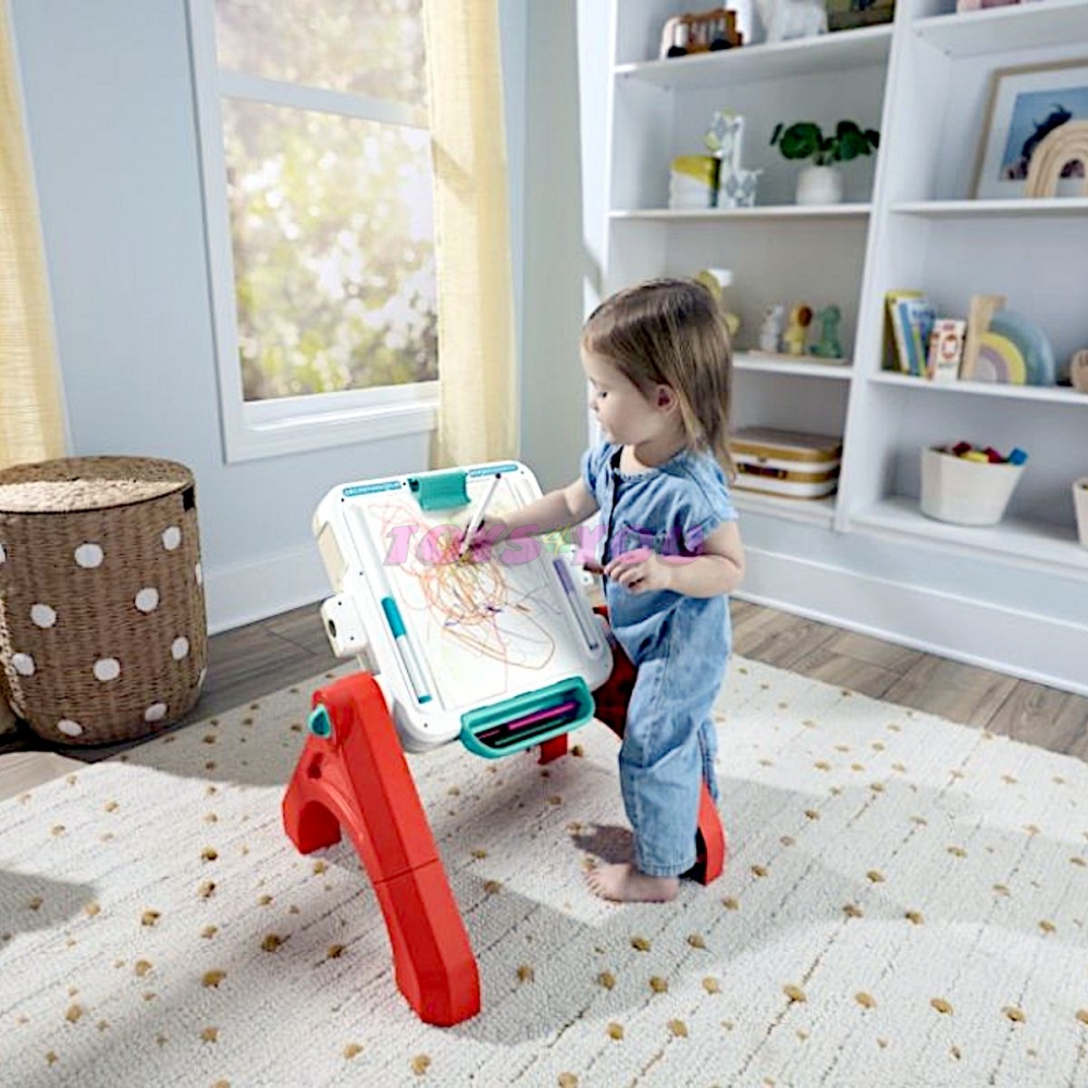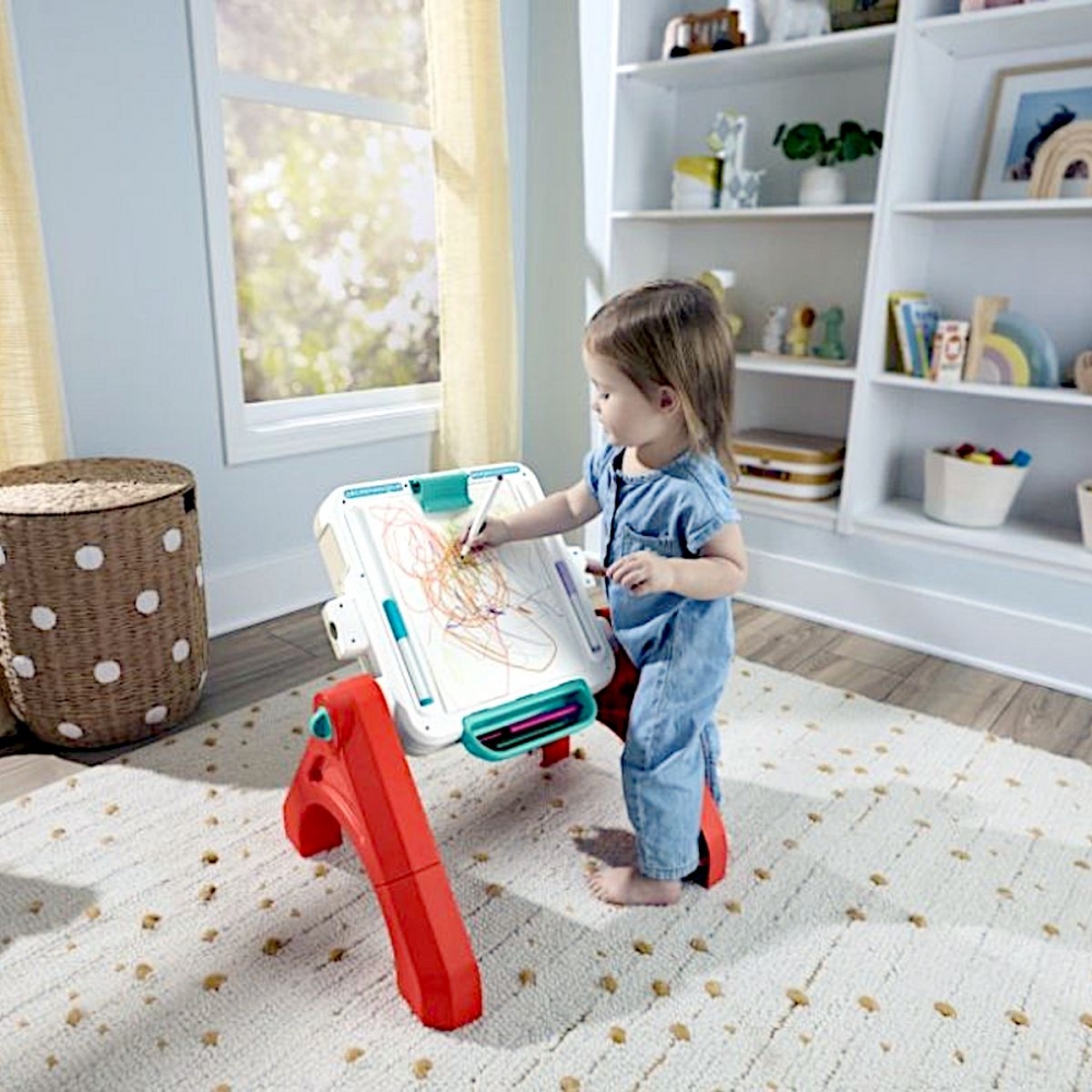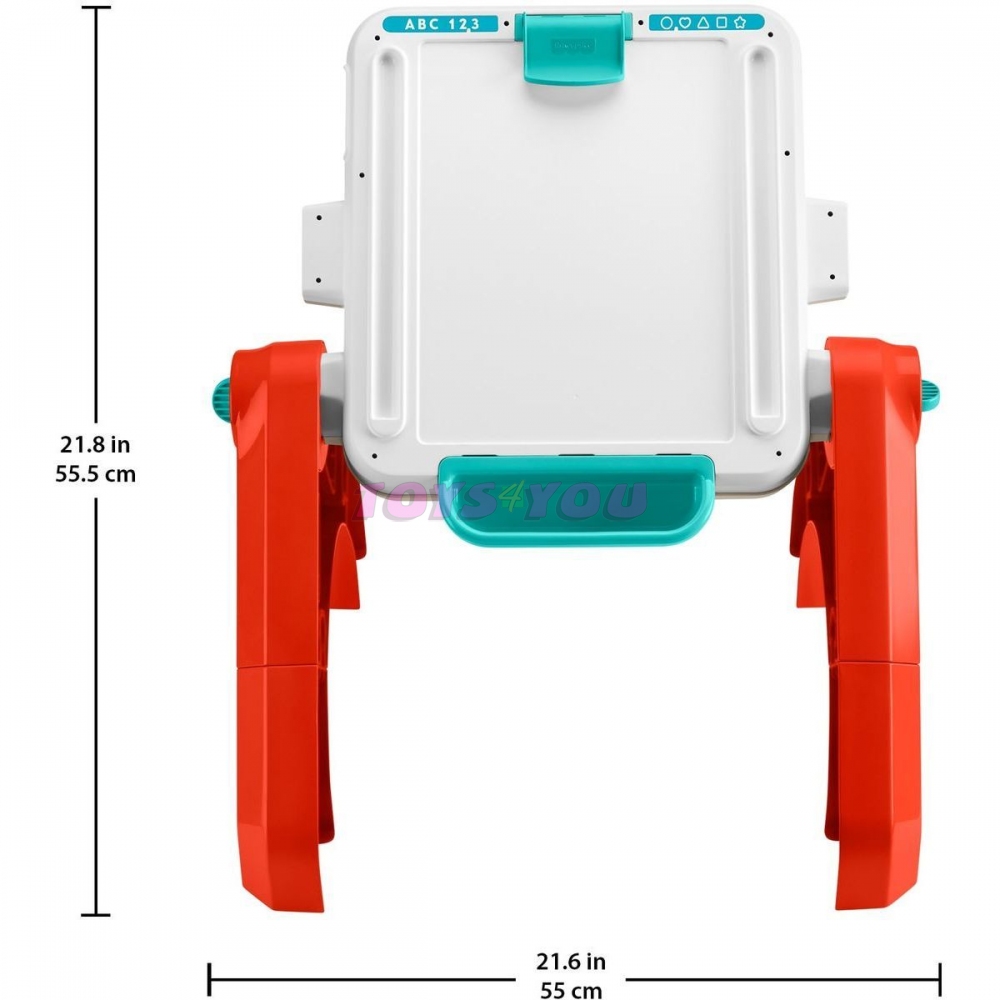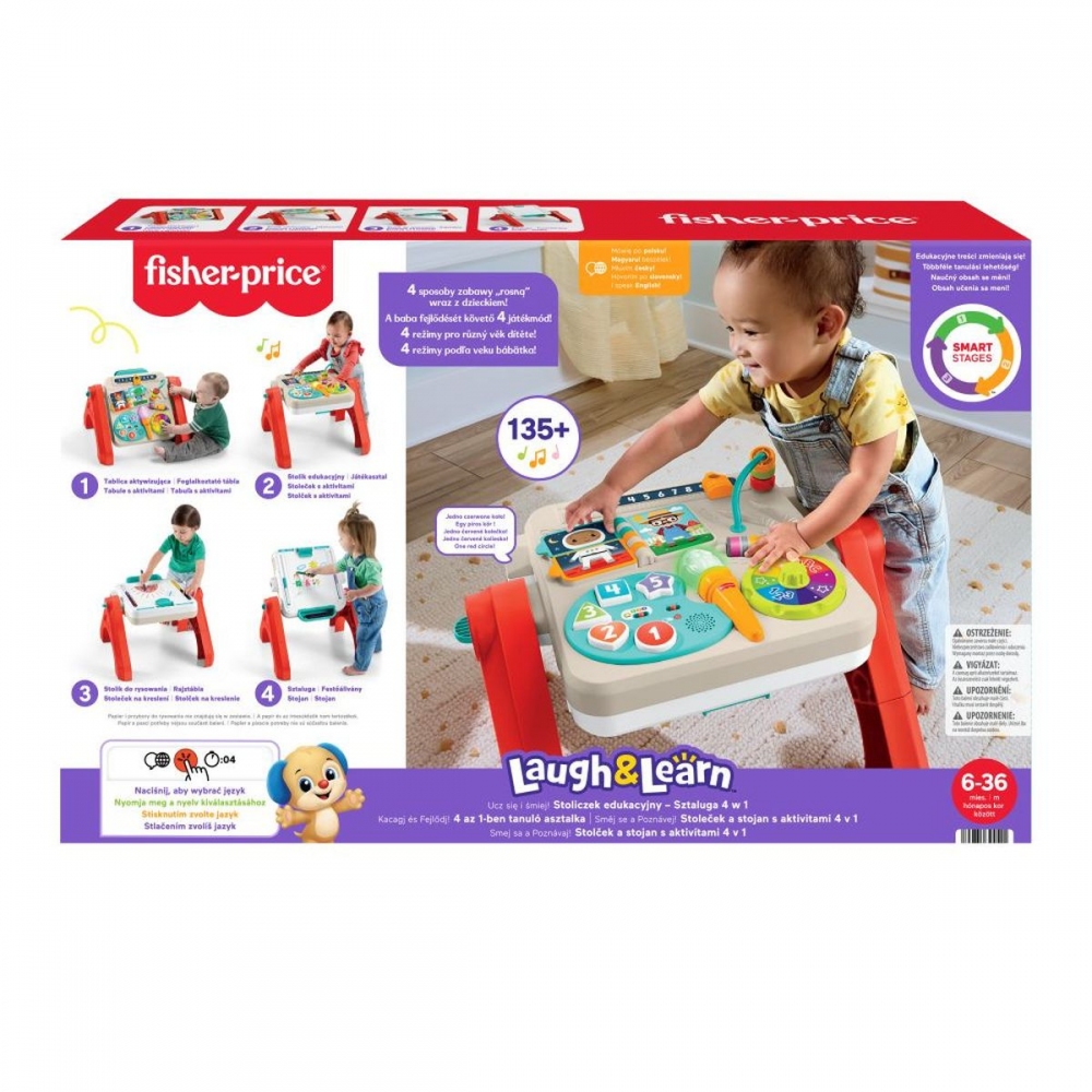 Tato elektronická vzdělávací hračka nabízí miminkům a batolatům čtyři způsoby, jak si hrát, učit se a tvořit. Transformuje se z hrací desky na stolek s aktivitami, hrací stůl nebo stojan! 3 úrovně učení Smart Stages s více než 135 písničkami, zvuky a frázemi, které hravou formou povzbuzují k učení barev, čísel a mnoha dalších věcí. Tlačítko s glóbem vybírá požadovaný jazyk: angličtinu, francouzštinu, němčinu, italštinu nebo holandštinu. Malé ručičky mohou mačkat barevná tlačítka nebo otáčet barevným kolečkem a aktivovat tak světla, hudbu a zvuky. Hračka také nabízí poutavé aktivity, jako je tyč s korálky, rolování tužek, posuvník s čísly a kniha s otáčením stránek. Opravdový stojan! Součástí je klips na připevnění papíru a úložný prostor na potřeby. Tato hračka pro miminka a batolata od 6 měsíců do 3 let podporuje motorické dovednosti, kreativní vyjadřování, hraní rolí, samostatnost a další. Rozměry produktu 28,26 × 42,28 × 66,36 cm; 2,56 kg. Baterie 3 AA vyžaduje baterie. Věk: 6m+
