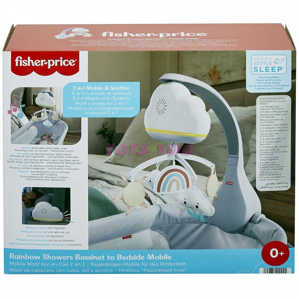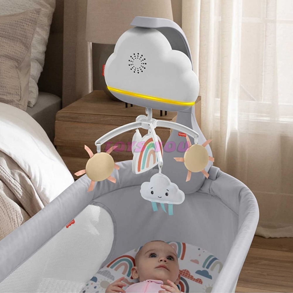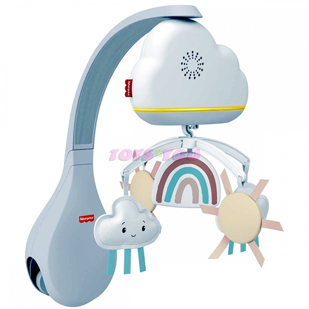 Fisher-Price® Kolotoč nad postýlku déšť s duhou má oslnivé závěsné hračky v podobě mráčků a sluníček a obsahuje 20 minutovou melodii, která pomůže vašemu novorozenci uvolnit se a usnout. Praktický snímač pláče automaticky spustí uklidňující hudbu a kolotoč, když děťátko vydá zvuk! Provoz na 3× AA/LR6 baterie (nejsou součástí balení). Rozměry: 55 × 21 cm (V x Š). Věk: 0+