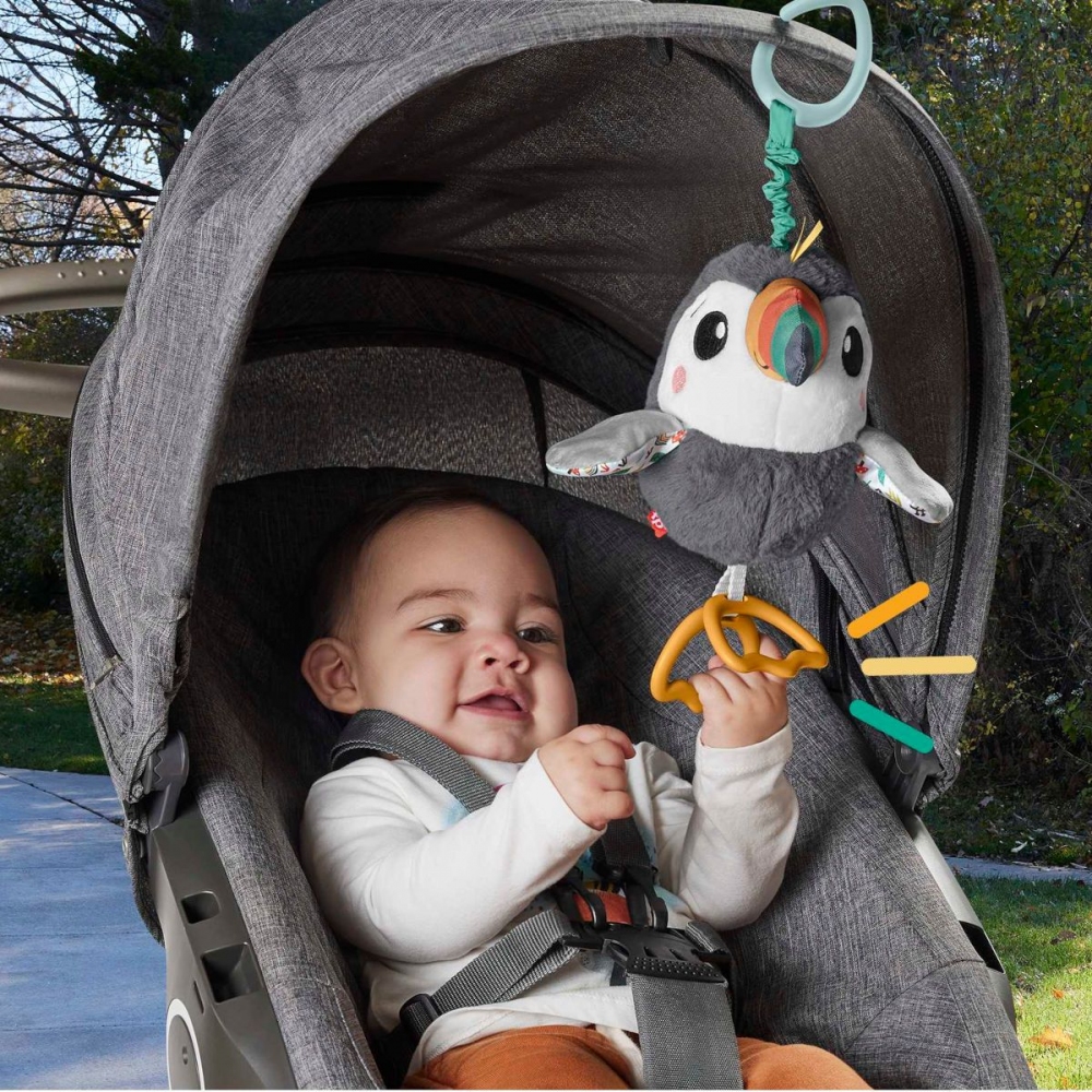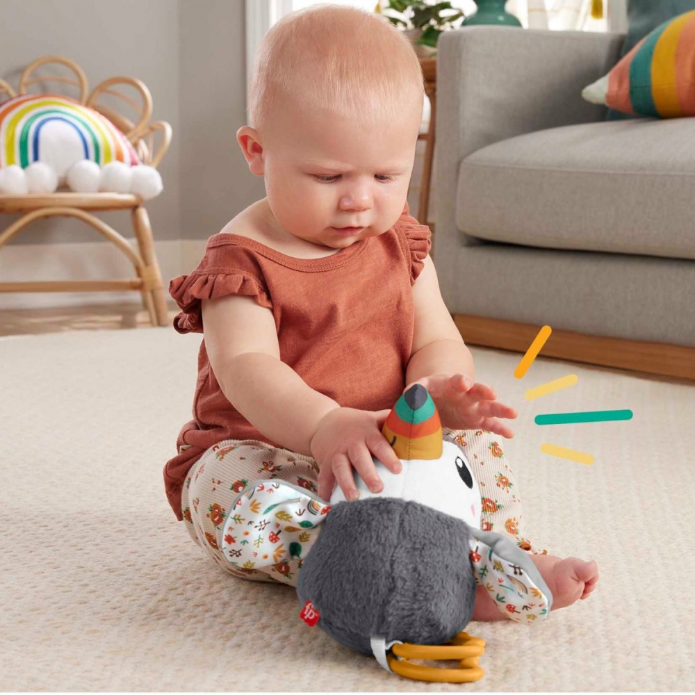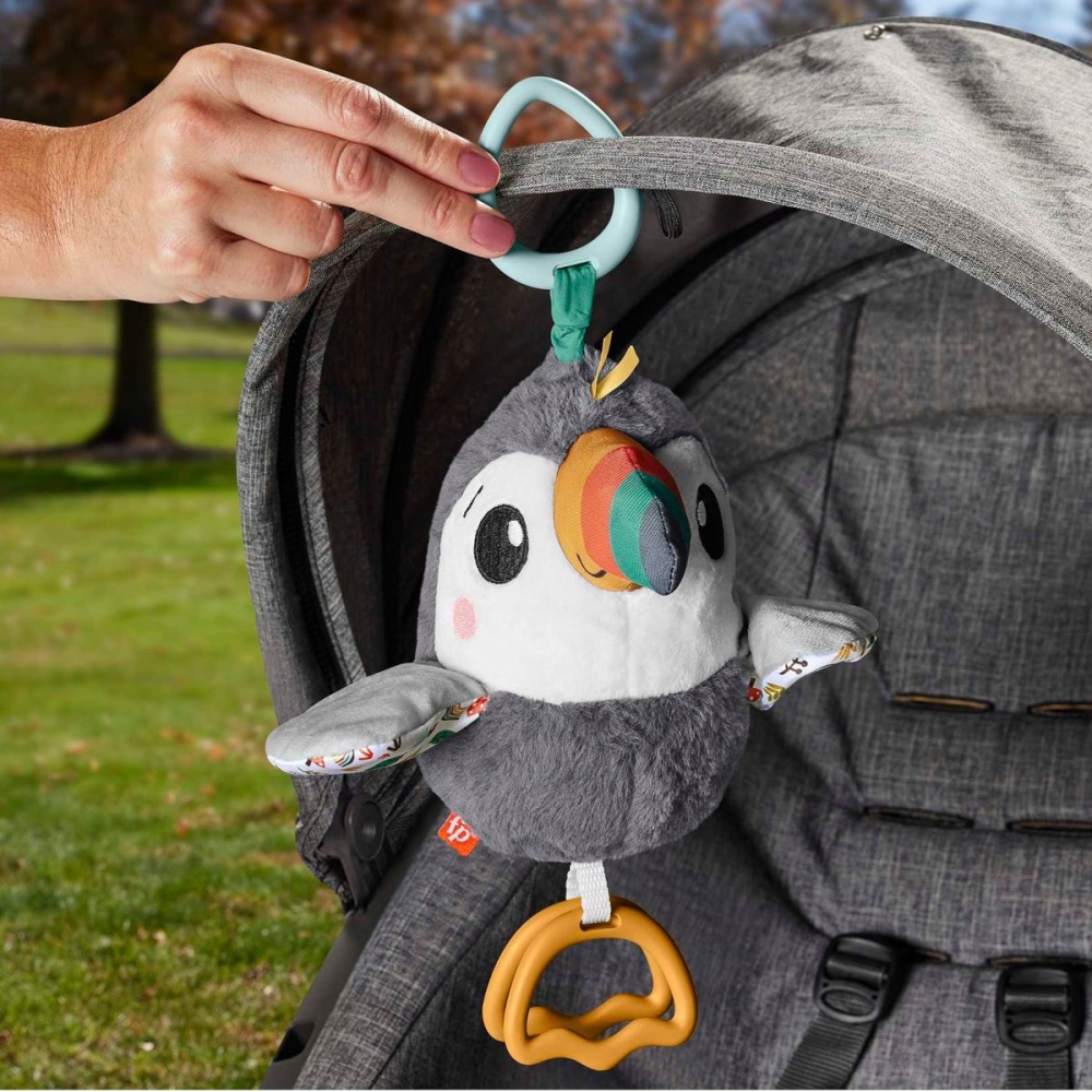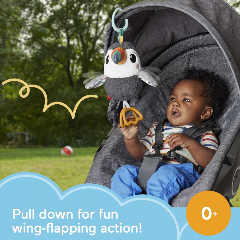 Vaše dítě se může vydat na tropické smyslové dobrodružství z pohodlí svého kočárku s hračkou do kočárku Flap & Go Toucan od Fisher-Price®. Tento plyšový ptačí kamarád má měkké látky pro malé ručičky k prozkoumání, zábavné zvuky vrásek a zvonění a vzrušující mávání křídly, které potěší vaše novorozeně. Jednoduše připevněte Flap & Go Toucan ke stříšce vašeho kočárku a užijte si zábavu s sebou! Vezměte si s sebou plyšový kočárek s tukanem se zábavným máváním křídly a smyslovými detaily, které zaujmou a potěší vaše dítě. Zatáhněte za nohy a uvolněte je, abyste viděli, jak křídla tukana mává nahoru a dolů. Senzorická hra pro novorozence: měkké plyšové látky, vrásčitý zobák, klapající nožičky a zvonění v břiše při odpalování nebo chrastění.