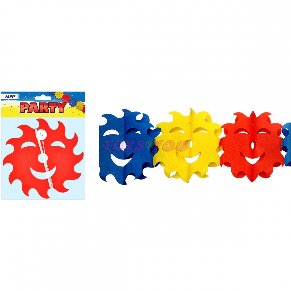 Papírová girlanda od společnosti MFP paper v různobarevném provedení s motivem slunce. Girlandy jsou oblíbeným doplňkem pro výzdobu místností. Touto girlandou nezkazíte dekoraci na žádné party, ať už se bude jednat o narozeninovou párty pro děti nebo pro dospělé. Zaručeně upoutá pozornost všech zúčastněných. POUŽITÍ: Barevné motivy jsou spojeny šňůrkou. Zavěste je za oba konce přes místnost dle Vaší libosti. Délka: 4 m Dodáváme v sáčku se závěsem. Uvedená cena je za 1 ks.