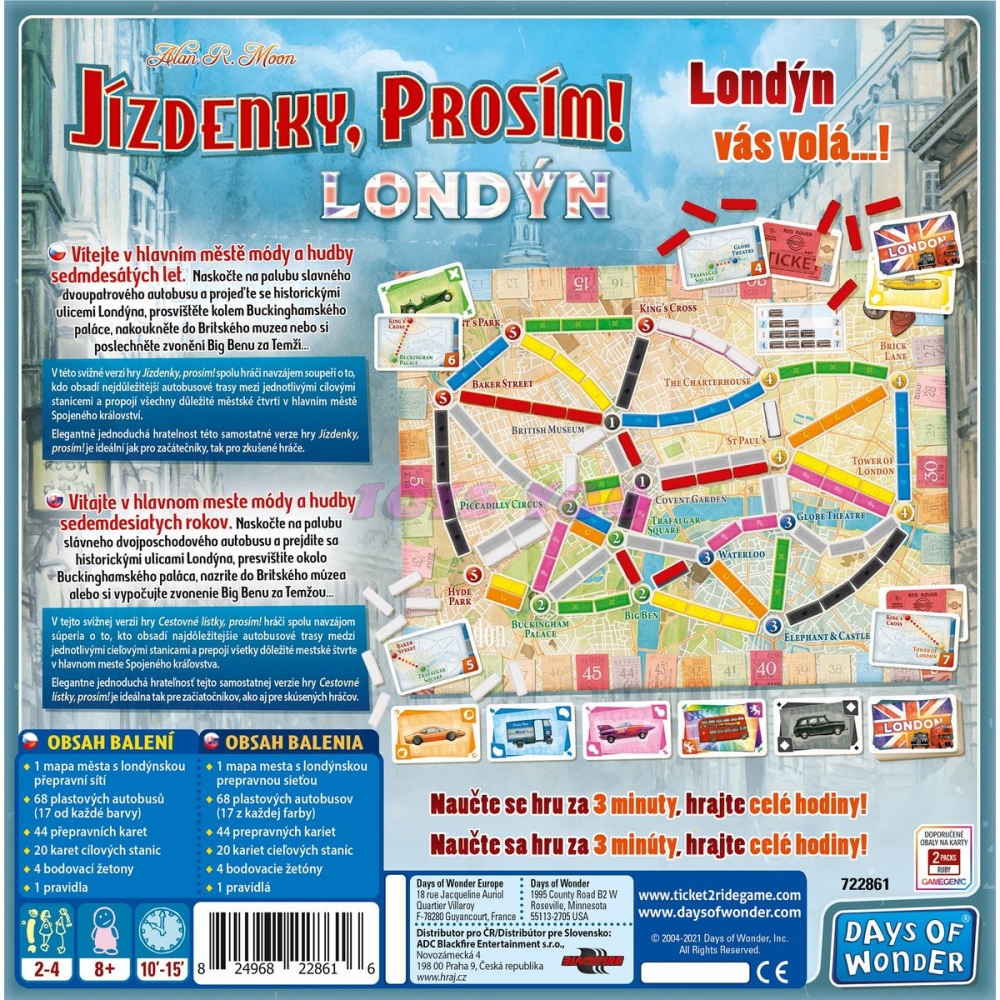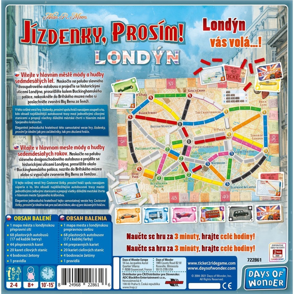 Svižná verze oblíbené hry Jízdenky, prosím!, která vás zavede do hlavního města módy a hudby 70. let. Do londýnských ulic se rozlévá pohlcující rytmus rockové hudby ruku v ruce s mladými lidmi oblečenými tak pestře, jak si jen kdo dokáže představit. Váš autobus sviští ulicemi k další zastávce, ale vás ani nenapadne vystoupit, cestování městem dvoupatrovým autobusem je prostě senzační! V této svižné verzi hry Jízdenky, prosím! spolu hráči navzájem soupeří o to, kdo obsadí nejdůležitější autobusové trasy mezi jednotlivými cílovými stanicemi a propojí všechny důležité městské čtvrti v hlavním městě Spojeného království. Elegantně jednoduchá hratelnost této samostatné verze hry Jízdenky, prosím! je ideální jak pro začátečníky, tak pro zkušené hráče. Naučte se pravidla do 3 minut a zažijte zábavu na dlouhé hodiny! Obsah balení: 1 mapa londýnské přepravní sítě 68 plastových autobusů (17 od každé barvy) + několik náhradních 44 přepravních karet 20 karet cílových stanic 4 bodovací žetony 1 česká a slovenská pravidla Licence Jízdenky prosím! Výrobce Days of Wonder Produktová řada DESKOVKA Balení 0 Jazykové mutace CS, SK Věk od 8 let Doba hraní 15 min. Počet hráčů 2-4 Věk: 8+