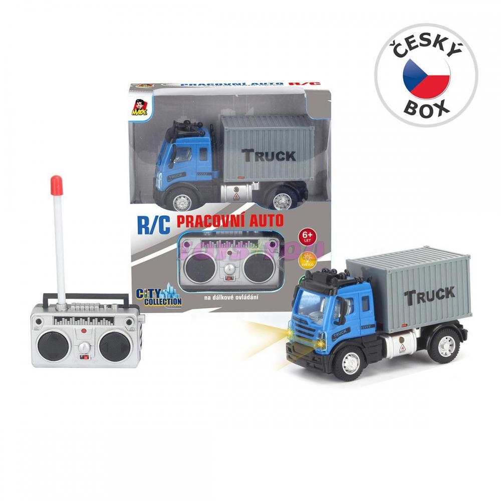 Pracovní auto s kontejnerem na dálkové ovládání z kolekce City collection. Ovladač v designu přenosného radiomagnetofonu. Auto jezdí dopředu, dozadu, vlevo a vpravo. Český box. Měřítko 1:64. Vhodné pro děti od 6 let. Světelné efekty.Napájení auto: baterie 2 x 1,5 V AA (nejsou součástí balení), ovladač: baterie 2 x 1,5 V AA (nejsou součástí balení). Auto obsahuje na spodní straně páčku jemného vyladění pohybu. Jestliže se auto při jízdě vpřed vychyluje na jednu stranu, je možné touto páčkou směr seřídit. Rozměry balení 19 x 16 x 6,5 cm. Věk: 3+