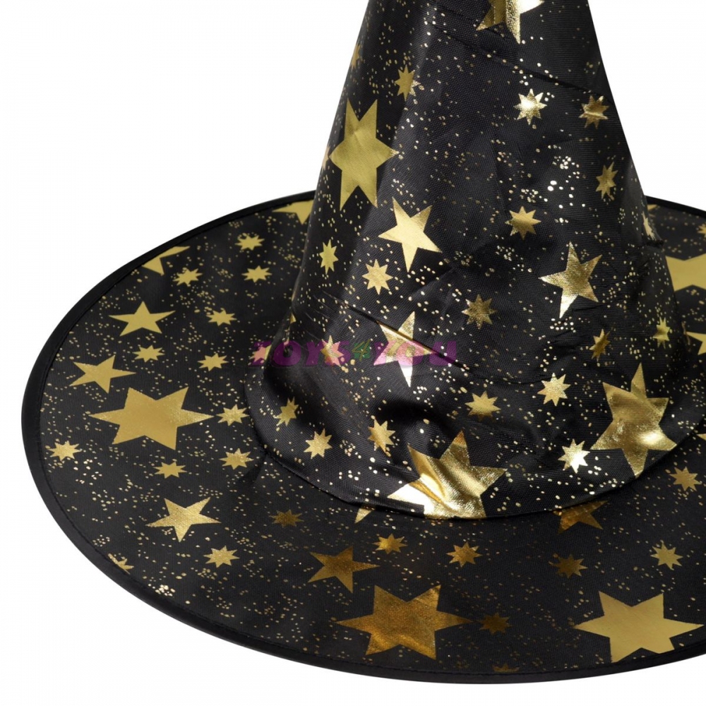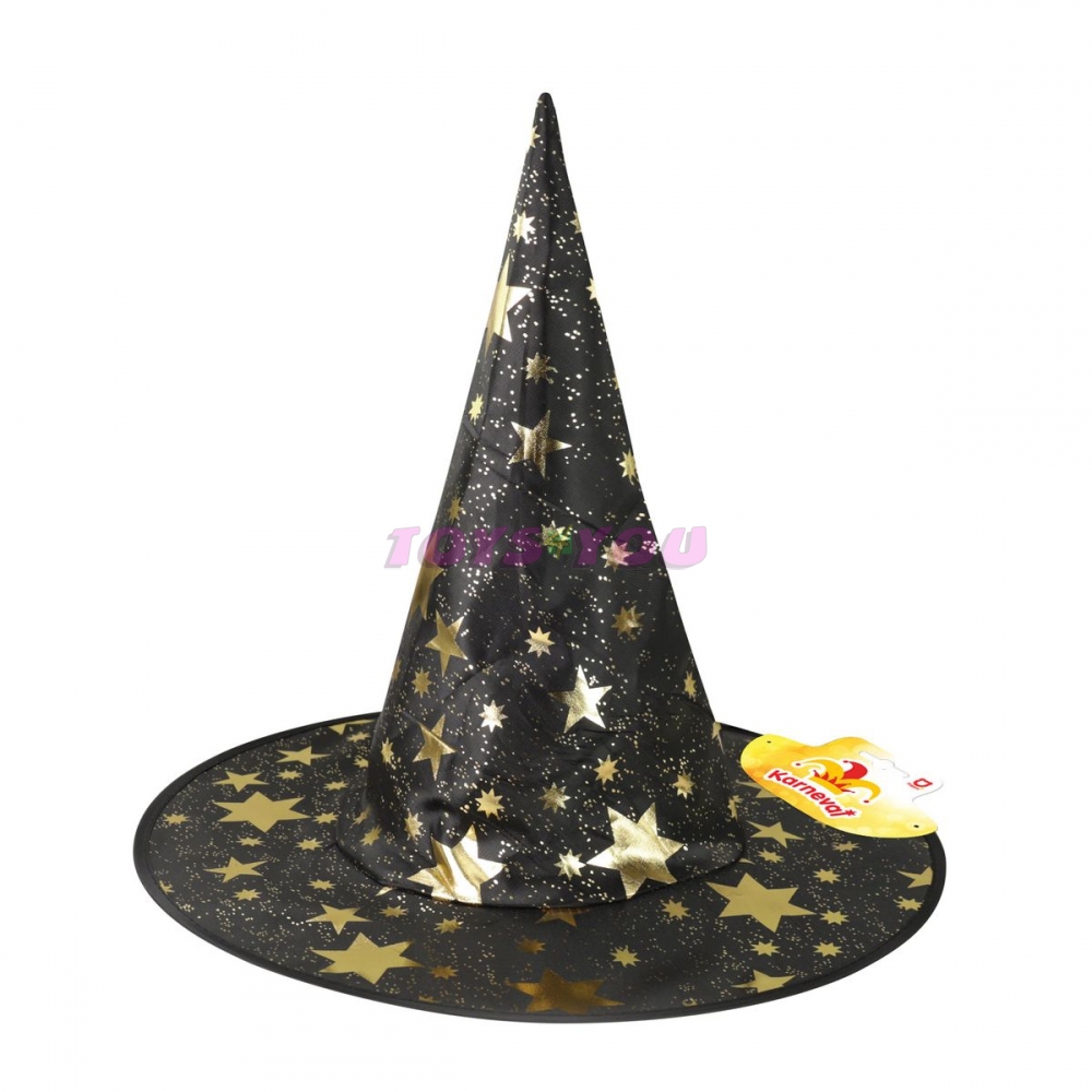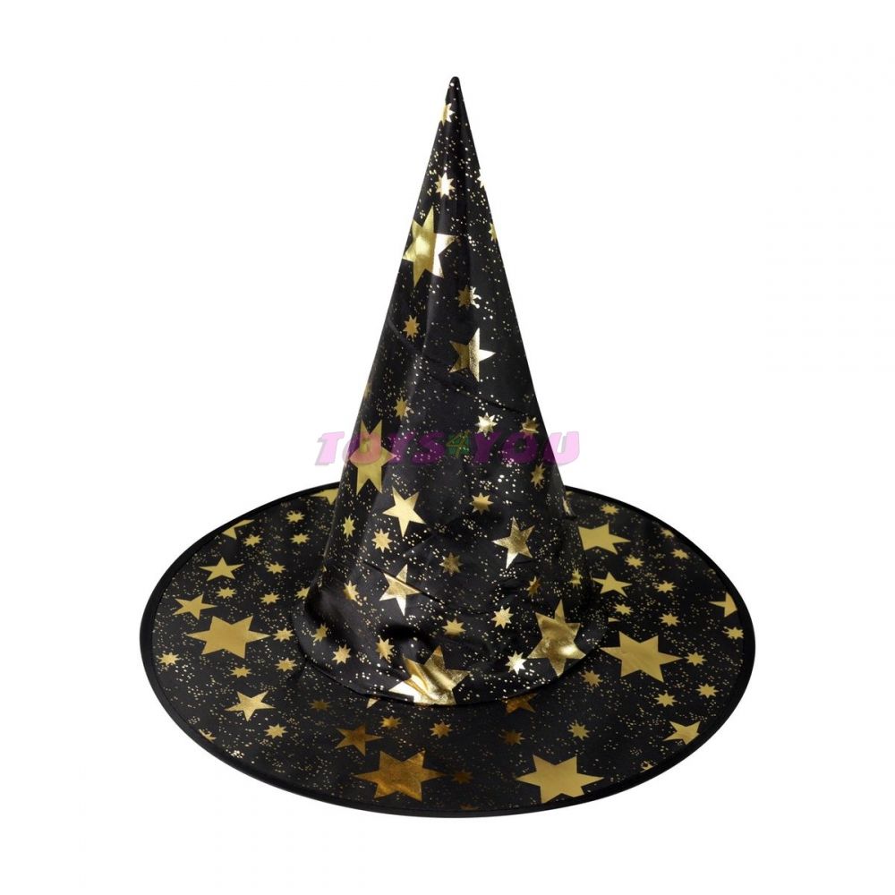 Dětský klobouk černý čarodějnický Úžasný čarodějnický klobouk v černé barvě s potiskem zlatých hvězdiček. Ideální i na halloweenský večírek nebo karneval! Rozměry balení Š×V×H 380×330×380 mm. Věk: 3+