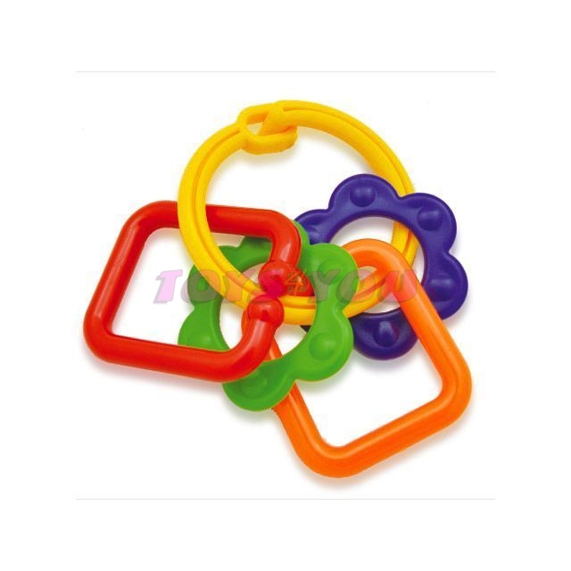 Barevné kousátko pro miminka. Velký kroužek pro snadné uchopení se 4 různými tvary. Hračka rozvíjí motorické a zrakové dovednosti a uklidńuje dítě při růstu zoubků. V nabídce různé druhy podle momentální nabídky dodavatele. Věk: 0+