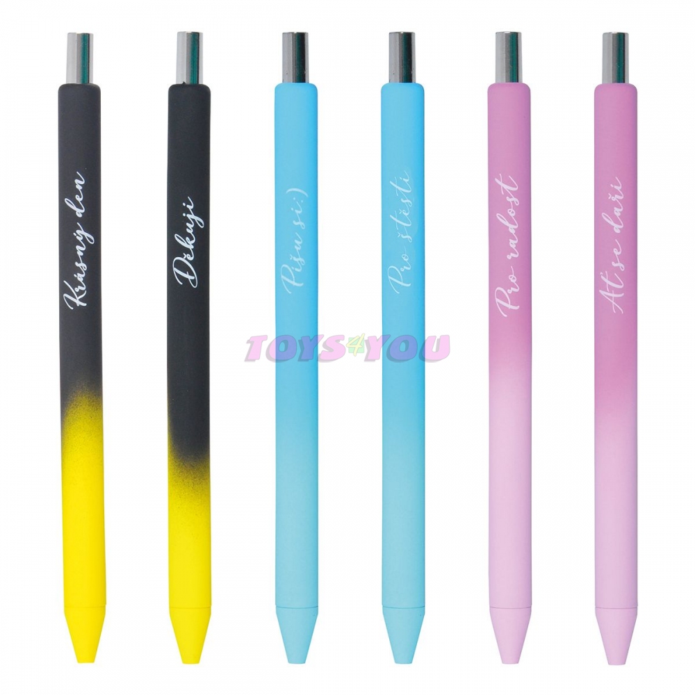 Objevte kouzlo psaní se stylovým kuličkovým perem Present! Modrá náplň s hrotem o šíři 0,7 mm zajistí dokonale plynulé tahy, které potěší každého, kdo miluje pohodlí při psaní. Jedinečný design každého pera zaujme jemným barevným přechodem a inspirativními nápisy, jako například „Krásný den“, „Děkuji“ nebo „Pro radost“. Hladké tělo padne příjemně do ruky a zpříjemní vaše chvíle ve škole, v kanceláři i doma. Perfektní dárek, který nejen splní svůj účel, ale také rozzáří úsměv na tváři! Hrot: 0,7 mm Počet kusů v balení: 24 ks Provedení: stiskací mechanismus Barva: černá/žlutá, tyrkysová, světlá růžová/tmavší růžová Dodáváme dle skladové dostupnosti. Uvedená cena je za 1 ks. Rozměr: 10mm x 148mm x 10mm (Š x V x H)