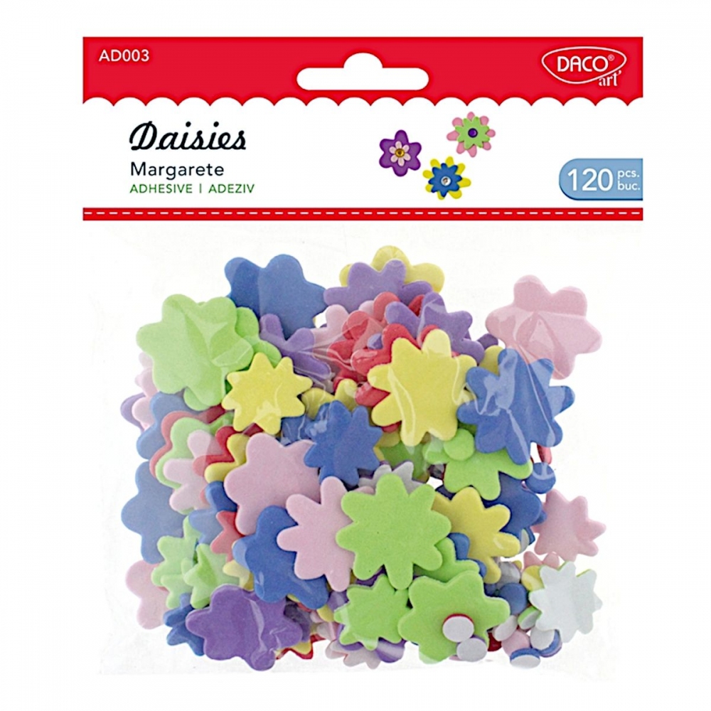 Květy pěnové samolepící. Balení obsahuje: 120 ks pěnových samolepících výseků květů v různých velikostech a barev. Věk: 3+