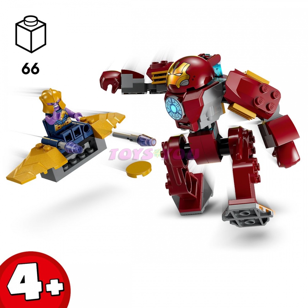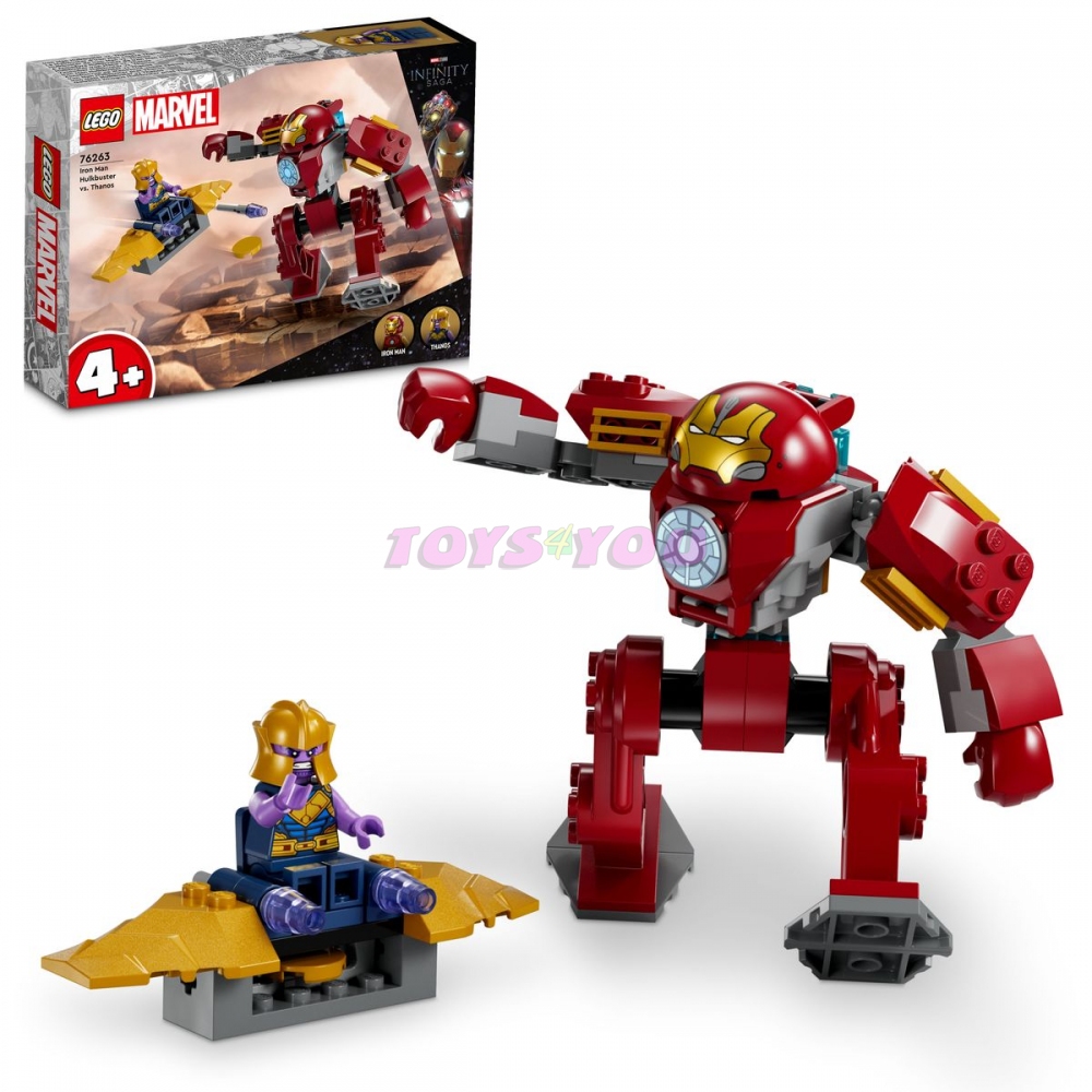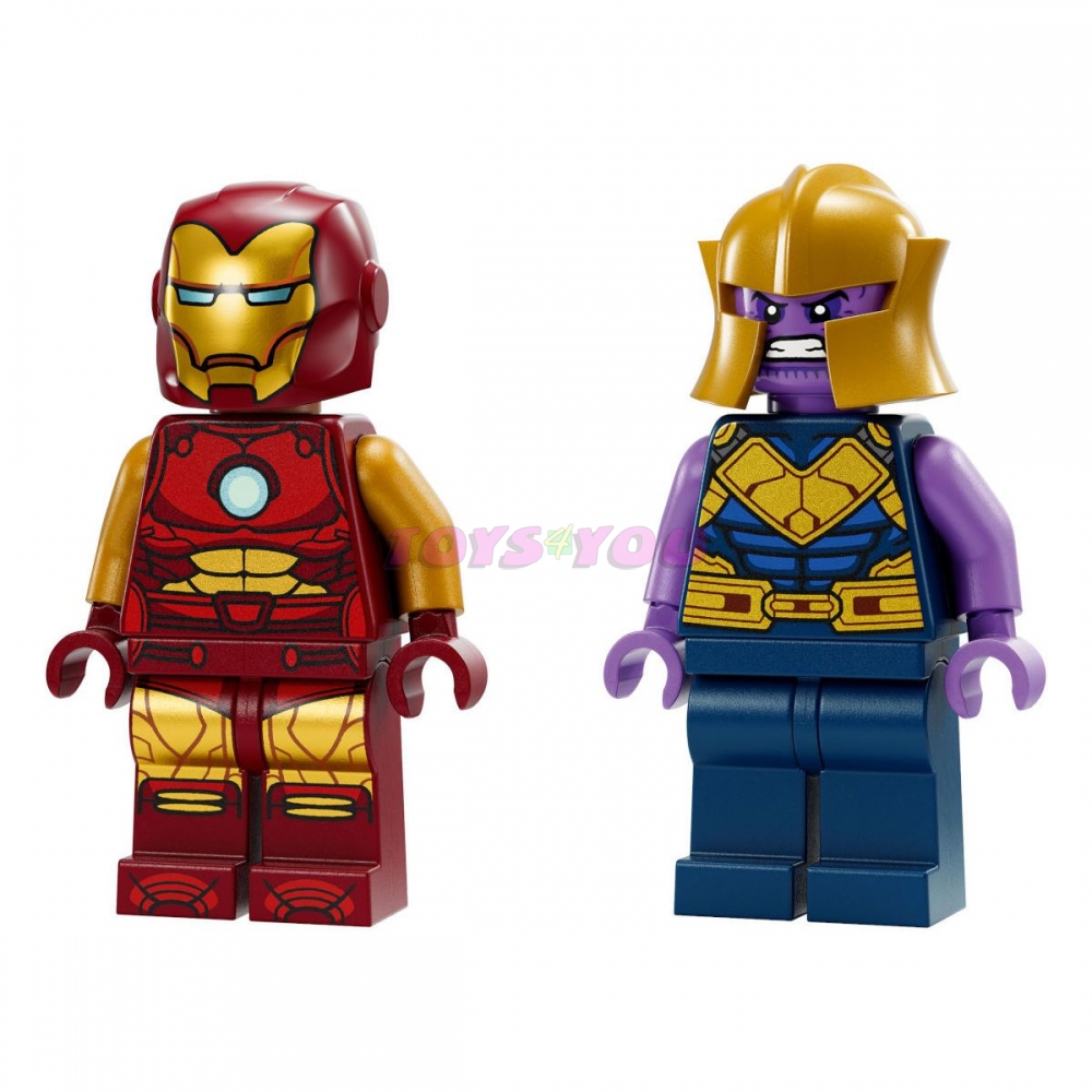 Tato stavebnice inspirovaná filmem Avengers: Infinity War znázorňuje střet superhrdiny Iron Mana a jeho robota se superpadouchem Thanosem a jeho letadlem. Robot Hulkbuster je pohyblivý a má v sobě sedačku pro minifigurku Iron Mana. Letadlo obsahuje vystřelovač disků a sedátko pro minifigurku Thanose. Každý sáček v balení obsahuje kostky pro kompletní model a postavičku, které si děti mohou ihned sestavit k hraní. Barevný návod vedený příběhem slouží jako návod na stavění a hraní a 2 začátečnické kostky k nohám robota ještě více zjednoduší stavění. Pro ještě zábavnější digitální stavění umožňuje zábavná a intuitivní aplikace LEGO Builder stavitelům přibližovat, otáčet modely ve 3D a sledovat postup.