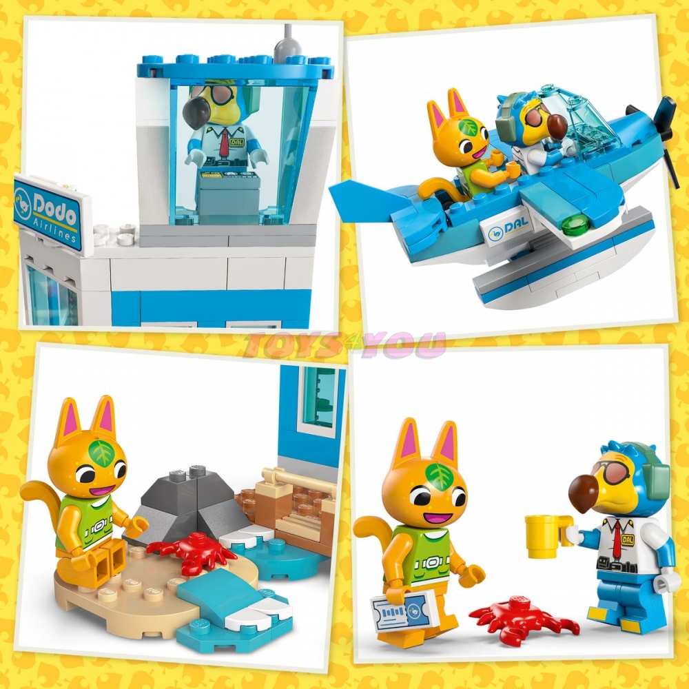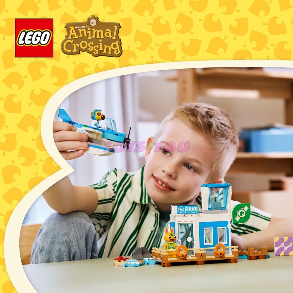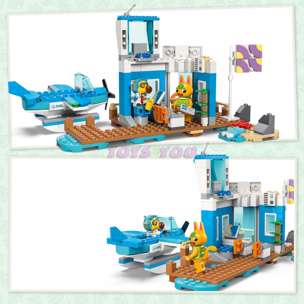 Tato funkcemi nabitá stavebnice dětem umožní přehrávat si vlastní příběhy ve známém prostředí Animal Crossing. Stejně jako ve videohře má letiště molo vedoucí na pláž, kontrolní věž a otevírací oranžovou bránu. Jakmile kluci a holky postaví model letadla, mohou cestující s letenkou nastoupit na palubu. Děti roztočí vrtuli hydroplánu a vydají se s minifigurkami pilota Wilbura a Tangy na nový ostrov.