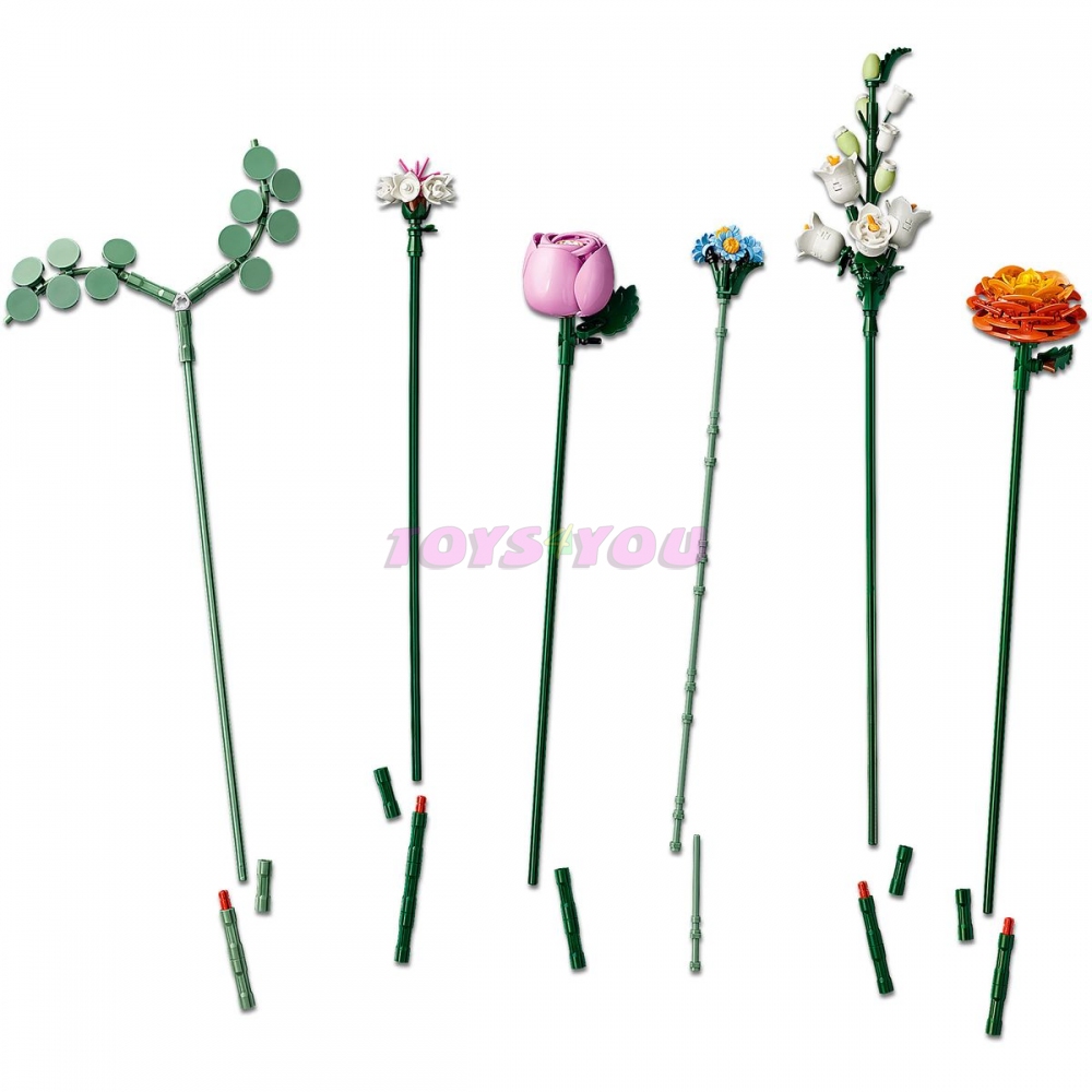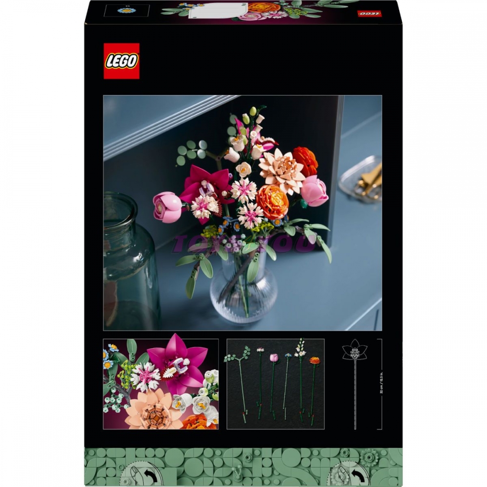 Začínající květináři si oddechnou při stavění kytice z 15 květin LEGO, včetně sedmikrásek, chrp, eukalyptu, bezových květů, růží, pryskyřníku, orchidejí Cymbidium, růžové jiřiny a zvonku. Stonek každého květu je nastavitelný, takže kytici si můžete naaranžovat podle libosti a vystavit si ji doma nebo v kanceláři. Květiny můžete naaranžovat společně s dalšími kyticemi LEGO (prodávají se samostatně), a vytvořit tak velký, unikátní výstavní kousek.