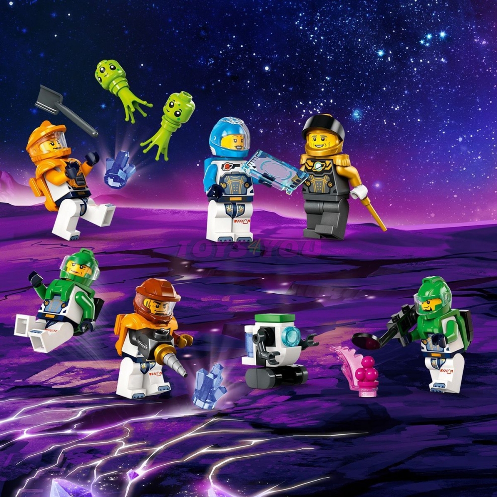 Co obsahuje vesmírná stavebnice LEGO® City? – Vše, co děti potřebují k sestavení vesmírné základny s 360° věžovým jeřábem, vesmírnou lodí, startovací rampou, nákladním vozem, prostředím planety, 6 minifigurkami, robotem a 2 figurkami mimozemšťanů