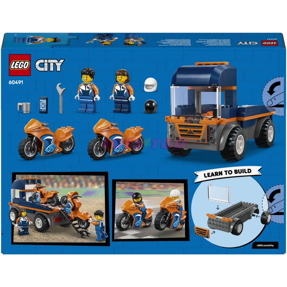 Kamion na přepravu závodních motorek Quick View Description Uveďte děti od 4 let do světa nápaditého hraní se stavebnicí LEGO® City Kamion na přepravu motorek (60491). Tato stavebnice s autíčky obsahuje nákladní auto s plochou korbou a masivními gumovými pneumatikami, 2 sportovní motorky a 2 minifigurky závodníků v helmách. Děti můžou pomocí rampy nakládat a vykládat motorky, hrát si na strhující moto závody s minifigurku usazenou v kabině a užít si zábavná dobrodružství na silnici. Součástí této stavebnice je začátečnická kostka LEGO pro snadné stavění, jednoduché obrázkové pokyny a 3D návod v aplikaci LEGO Builder, která obsahuje nástroje přibližování a otáčení, aby si děti mohly během stavění prohlížet modely ze všech úhlů. Stavebnice představuje zábavný dárek k narozeninám nebo jakékoli jiné příležitosti pro děti, které milují závodění, nápadité hraní a vymýšlení příběhů. Zkombinujte ji s dalšími stavebnicemi z řady LEGO City (prodávají se samostatně) a zažijte ještě více napínavých závodů. Stavebnice obsahuje 88 dílků. Věk: 4+.