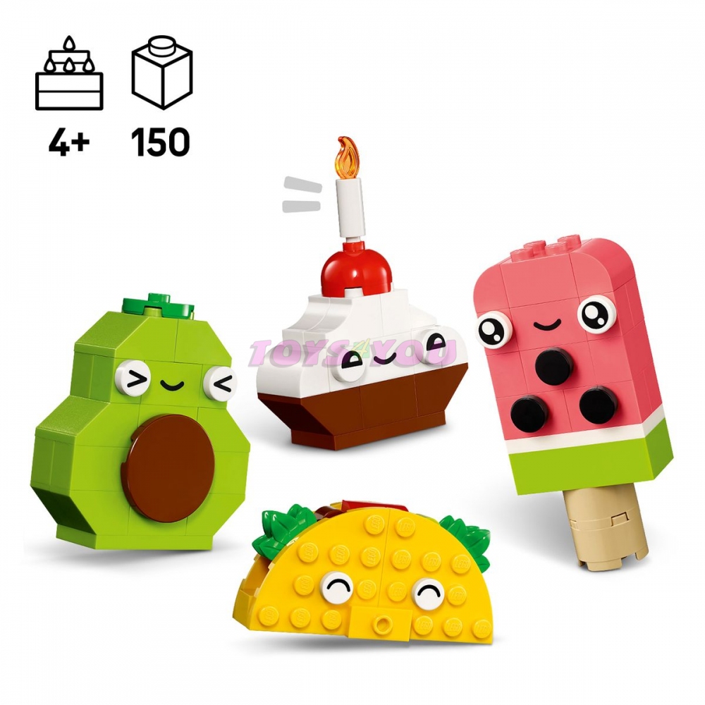 Děti si pomocí pestrobarevných a poutavých kostek a speciálních dílků, jako jsou oči, ústa a řada dekorativních prvků, postaví 4 roztomilé hračky ze stavebnice Kreativní jídlo: Cupcake, zmrzlinu, avokádo a taco. Kreativní zábava bude pokračovat, když děti kostky promíchají a přestaví modely na dort s posypem, bubble tea, hrušku a panini. Až děti získají větší sebevědomí při stavění, mohou podle intuitivního návodu na stavění měnit jejich výrazy, tvary nebo barvy a poskládat si nové kamarády: Zelenou zmrzlinu, krabici džusu, kousek melounu, čokoládovou tyčinku a mega sendvič.